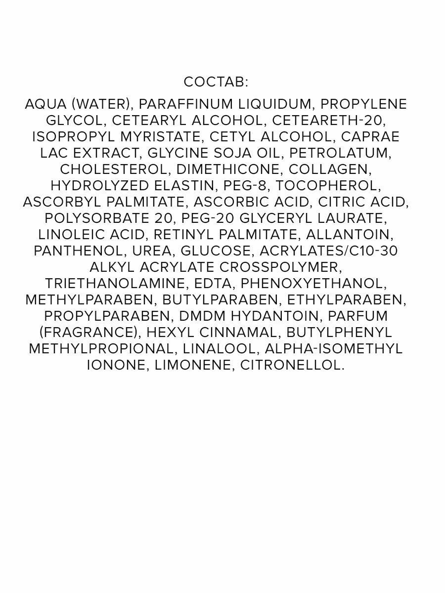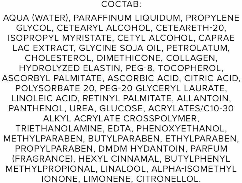 | Состав | aqua water; paraffinum liquidum; cetearyl alcohol; ceteareth -20; propylene glycole; petrolatum; glycerin; dimethicone; isopropyl myristate; cetyl alcorol cydopentasiloxane; caprae lac extract; colagen hydrolyzed elastin; phenoxyethanol; methylparaben; propy/paraben; ethylhexyl methohycinnamate; urea; glucose; allanton; tholesterol; polysorbate 20; peg-20 glyceryl; laurate; tocopherol; linoec acid; retinyl palmitate; bht; partum; disodium edta; alpha-isomethyl; lonone; hexyl cinnamal; linaloo |