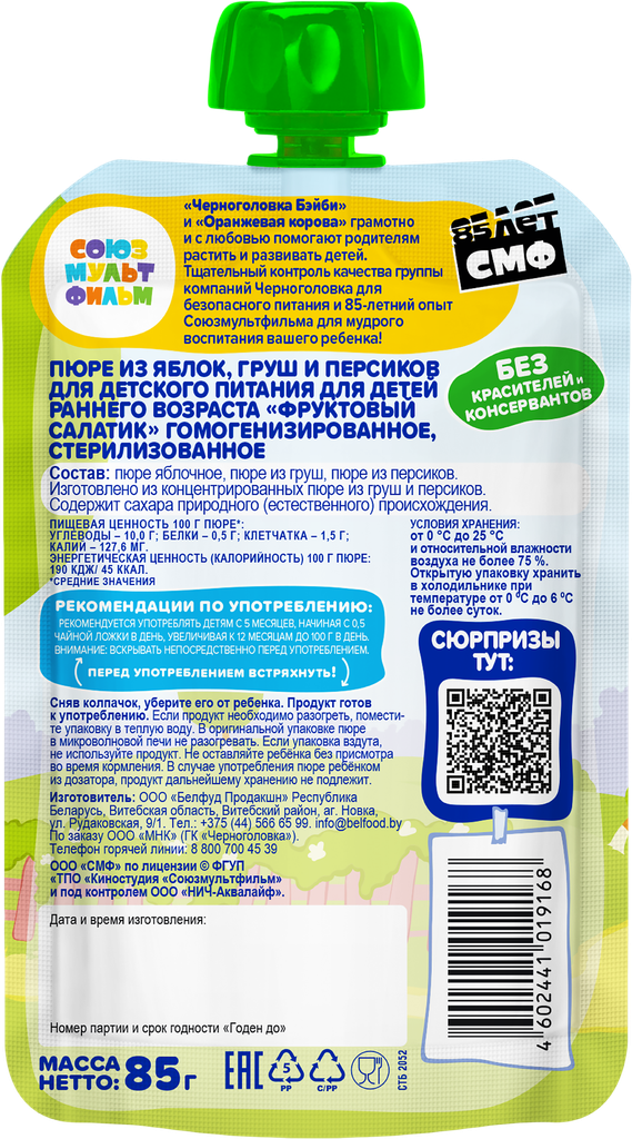 Вкусный и 100 % натуральный продукт, который удобно взять с собой на прогулку, в поездку или на пикник. Благодаря удобной и безопасной упаковке для еды не нужна ложка и ребёнок может есть самостоятельно, не пачкаясь. А изображения героев любимого мультсериала «Оранжевая корова» развлекут и порадуют малыша.