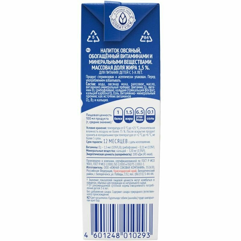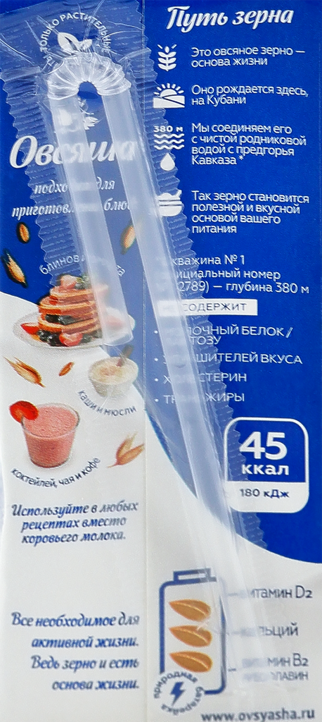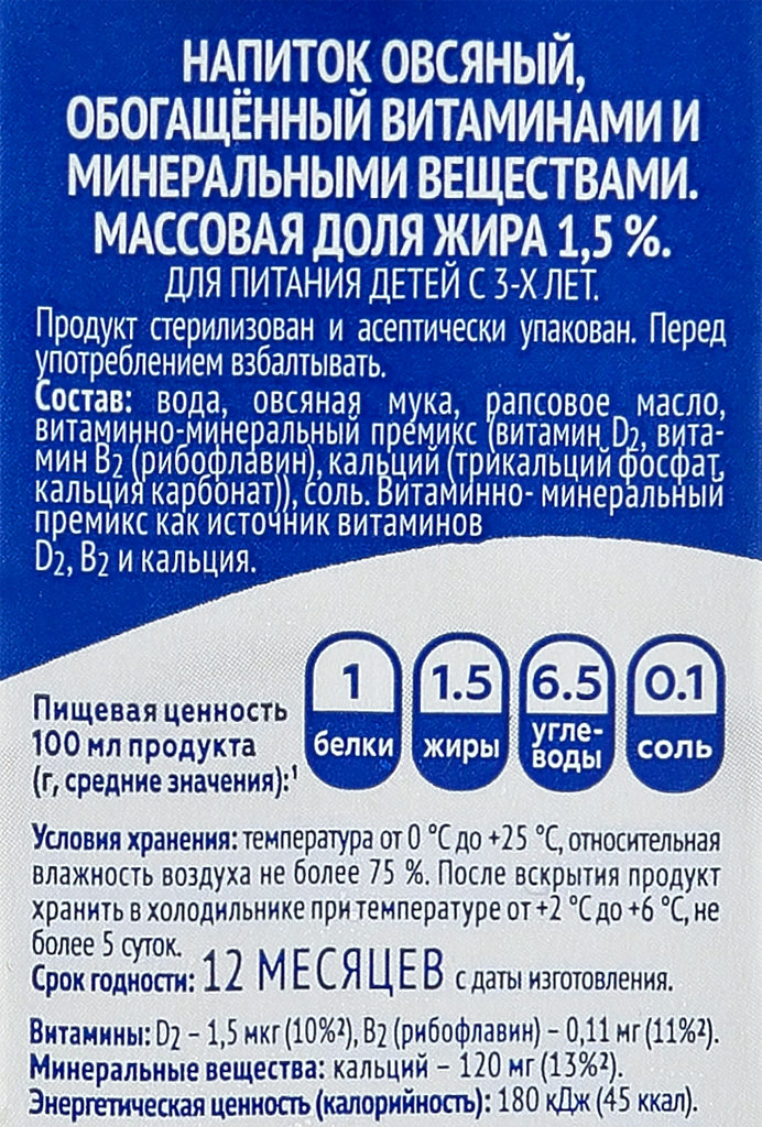 | Состав | Вода, овсяная мука, рапсовое масло, витаминно-минеральный премикс (витамин D2, витамин В2 (рибофлавин), кальций (трикальций фосфат), кальция карбонат), соль. |