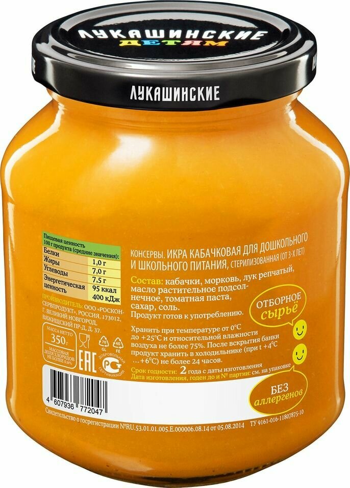 Икра из кабачков для дошкольного и школьного питания 350 г. Основным отличием данной линейки от обычной продукции являются:- Более жёсткие требования к содержанию нитратов – их норма допуска в два раза ниже, чем у обычной продукции, а именно не более 200мг/кг;- Отсутствие в составе раздражающих ингредиентов – жгучие специи, уксусная кислота и т. п;- Отсутствие в составе аллергенов;- Низкое содержание соли в икре из кабачков и баклажанов – массовая доля хлоридов не более 0,6%, в соответствии с ГОСТ Р 52476-2005 Консервы на овощной основе для питания детей раннего возраста.Приготовлено из отборных овощей под специальным контролем качества.