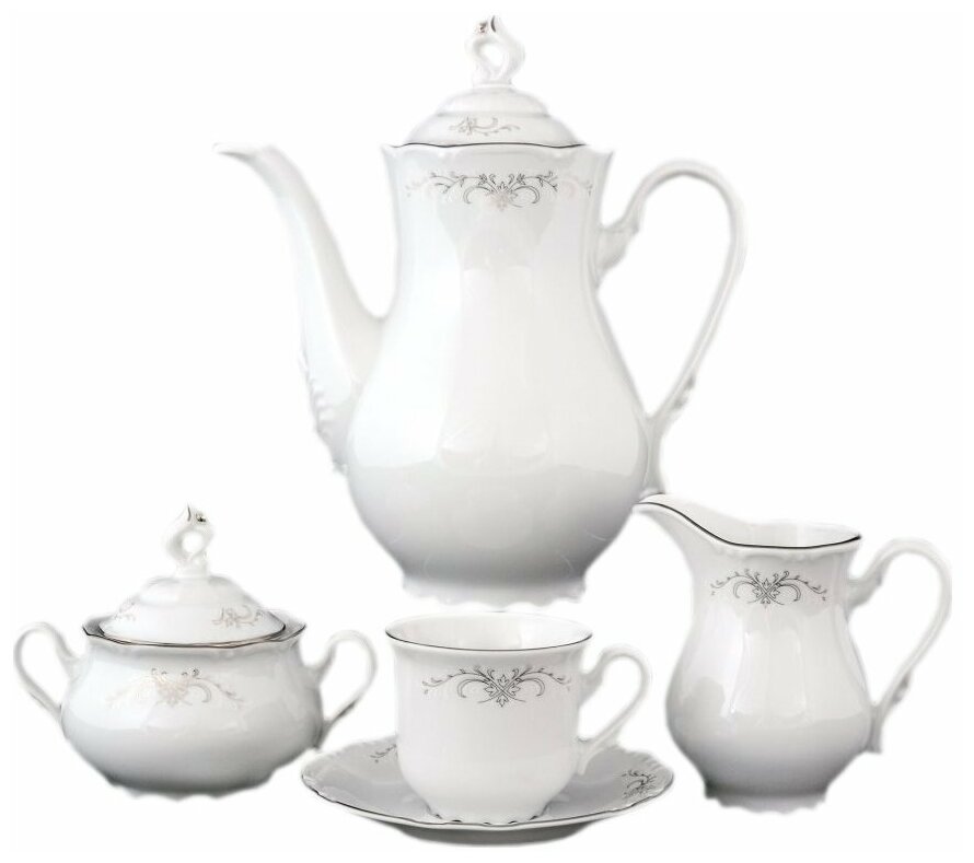 Кофейный сервиз на 6 персон 15 предметов Thun "Констанция /Серый орнамент /отводка платина" 0 - прекрасный выбор для любителей кофе. Посуда предназначена на компанию из 6 человек. Основной цвет белый, форма констанция, декор с платиной. Набор состоит из 15 предметов.Товар выполнен из фарфора, произведен чешской компанией Thun. Кофейник 1,2 л -1 шт, Молочник 250 мл - 1 шт, Сахарница 250 мл - 1 шт, Чашка 160 мл - 6 шт, Блюдце 13,5 см - 6 шт.