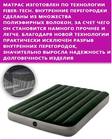 Надувной матрас серии Prestige Downy Bed изготовлен по технологии Fiber-Tech. Внутренние перегородки сделаны из множества полиэфирных волокон, за счет чего он становится намного прочнее и легче. Благодаря новой технологии практически исключен разрыв внутренних перегородок, значительно выросла надежность и долговечность изделия. Флокированное покрытие матраса не даёт соскальзывать белью, и в то же время легко чистится. Клапан 2-в-1. Накачать матрас можно любым механическим или электрическим насосом Intex. В комплект входит самоклеящаяся заплатка.
