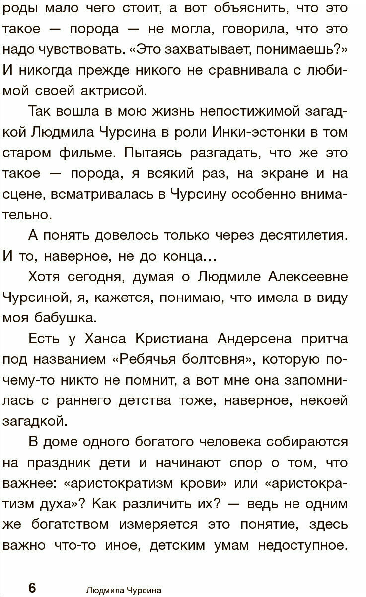 «Людмила Чурсина — аристократка духа во всех проявлениях, человеческих и профессиональных. Это начертано на ее красивом, гордом лице, в самой посадке головы, в манере держаться просто, скромно, но с неизменным чувством собственного достоинства, в ее умении общаться со зрителями и коллегами. Из любой, даже довольно скудной по материалу кинороли, она выстраивает сильную, всегда остающуюся “с прямой спиной” личность».