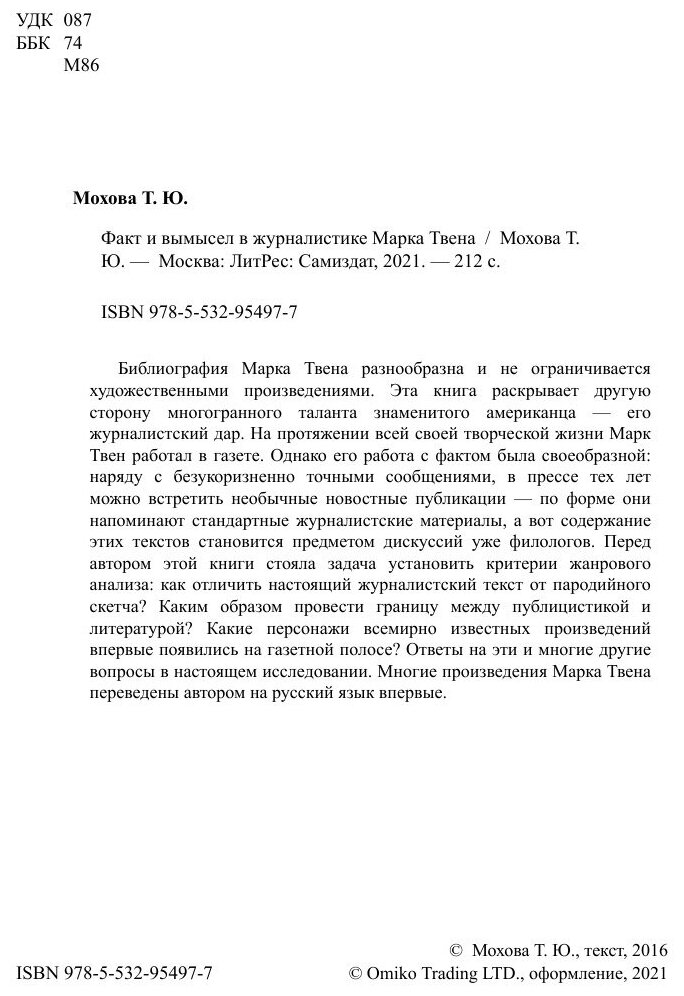 Факт и вымысел в журналистике Марка Твена (Татьяна Юрьевна Мохова); Автор, 2016