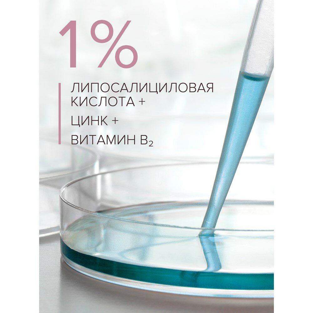 Для жирной и проблемной чувствительной кожи. Мягко удаляет загрязнения и макияж. Уменьшает жирный блеск. Матирует. ЛИПОСАЛИЦИЛОВАЯ КИСЛОТА, ВИТАМИН B2 и ЦИНК в концентрации 1 % подавляют секрецию себума, уменьшают жирность кожи, предупреждают появление акне. МИЦЕЛЛЫ бережно удаляют легкие загрязнения и нестойкий макияж. МАСЛА МИНДАЛЯ и ВИНОГРАДНЫХ КОСТОЧЕК восстанавливают гидролипидную мантию. ЭКСТРАКТ МЯТЫ помогает доставить ухаживающие компоненты в глубокие слои эпидермиса. УВЛАЖНЯЮЩИЕ АГЕНТЫ - аллантоин, мочевина, глицерин - снижают ощущения стянутости. Аллантоин предупреждает закупорку пор. ВИТАМИН С - beauty-антиоксидант предупреждает преждевременное старение. АВОКУТИН корректирует работу сальных желез, уменьшает себорею. ЭКСТРАКТ ПУЭРАРИИ способствует повышению тонуса, уменьшению выраженности возрастных изменений. STRESS BLOCK COMPLEX-4 (на основе пиперонила глюкозида) уменьшает покраснения. ТЕРМАЛЬНАЯ ВОДА успокаивает, восстанавливает кожу. Повышает естественный иммунитет.