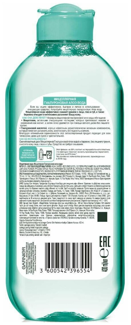 Мицеллярная вода Garnier Гиалуроновая Алоэ вода 400мл