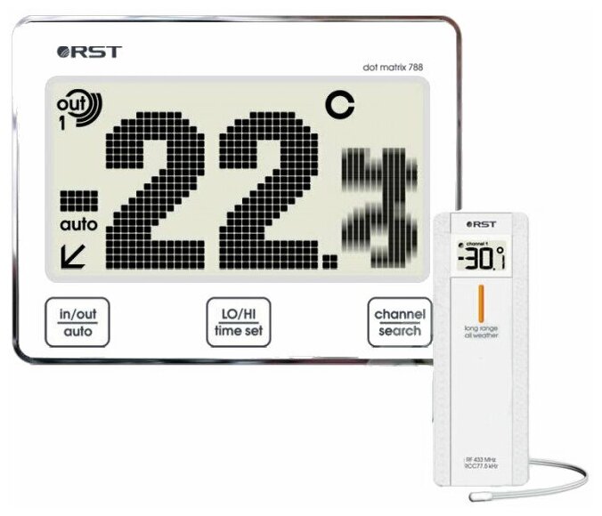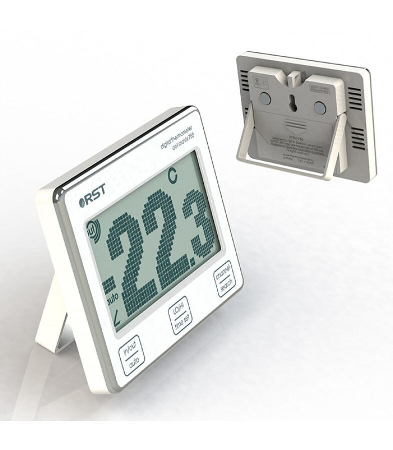 Цифровой термометр с новым анимированным точечно матричным дисплеем. Большой контрастный экран на котором отображена температура воздуха в помещении и/или на улице, полученная с радиодатчика. Кроме того на дисплее отображена максимальная и минимальная температура за текущие сутки и тенденция изменения температур. Беспроводный термометр может быть установлен в любом месте: на подставку, повешен на стену, на верёвку, при помощи магнита легко крепится на металлическую поверхность.