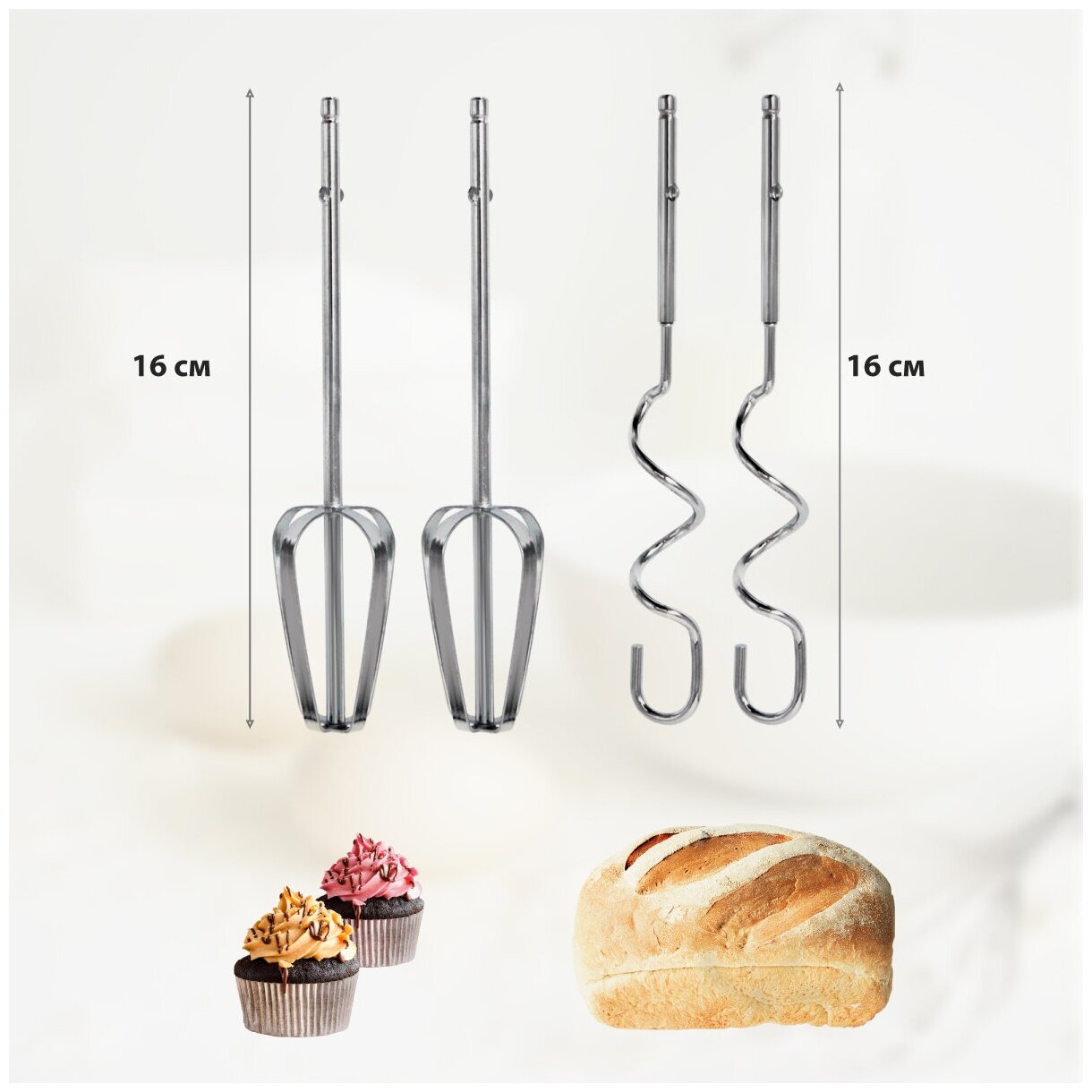 | Комплектация | венчики для взбивания, крюки для замешивания |