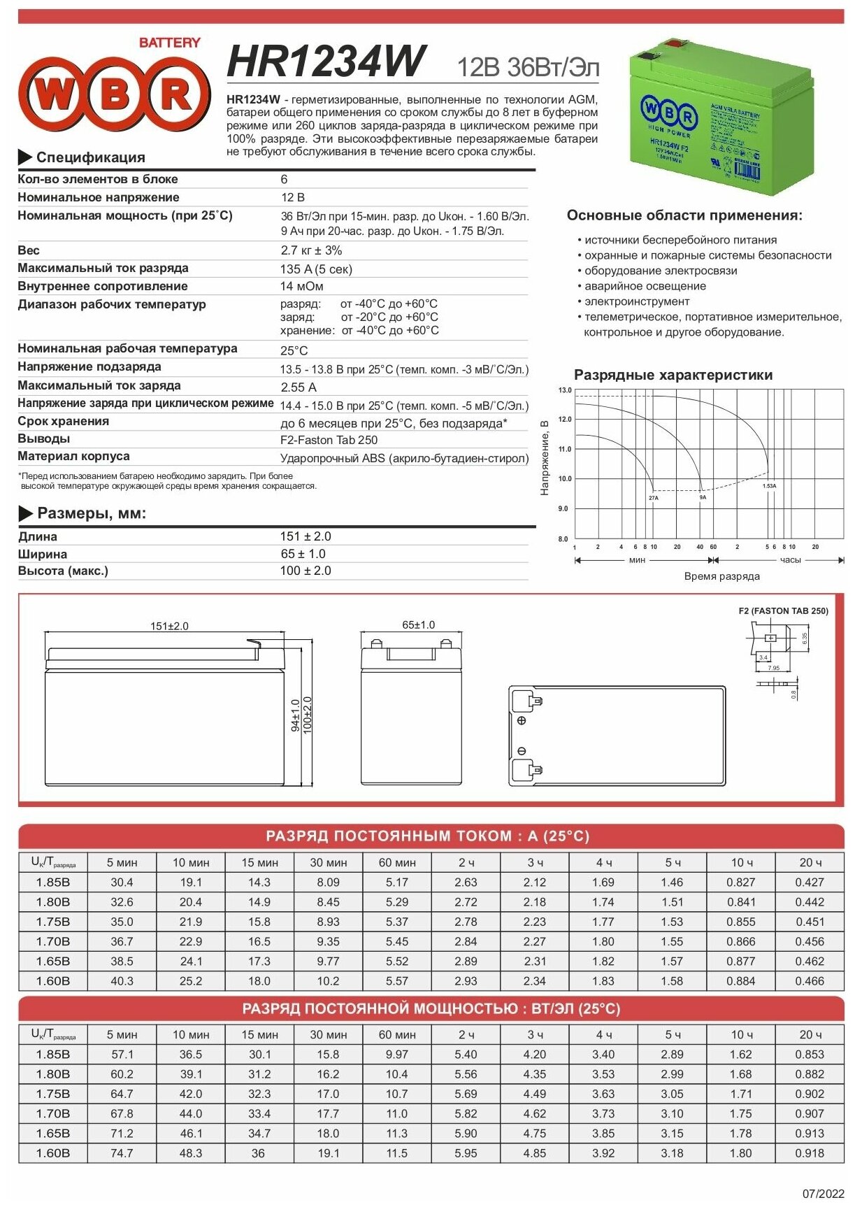 | Номинальная емкость | 9А/ч |