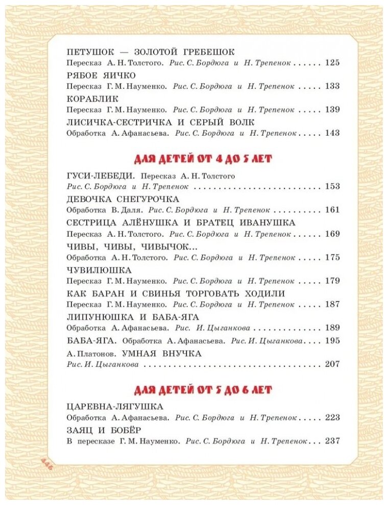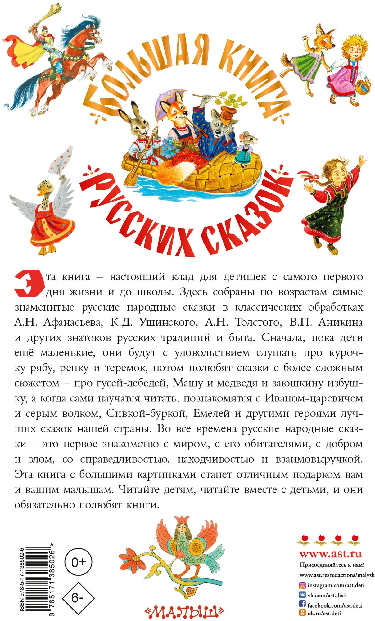 В "Большой книге русских сказок" собраны самые знаменитые русские сказки в классических обработках А.Н. Афанасьева, К.Д. Ушинского, А.Н. Толстого, В.П. Аникина и других знатоков русских традиций и быта. Слушая сказки, малыш учиться сопереживать, различать добро и зло, ценить справедливость и дружбу. В этом сборнике сказки разделены по возрастам для лучшего восприятия услышанного, а потом уже и прочитанного: для детей до 3 лет, для детей 3-4 лет, для детей 4-5 лет и для детей 5-6 лет. Большие, яркие, подробные иллюстрации помогут юным читателям погрузиться в мир русских сказок и подружиться с их героями.