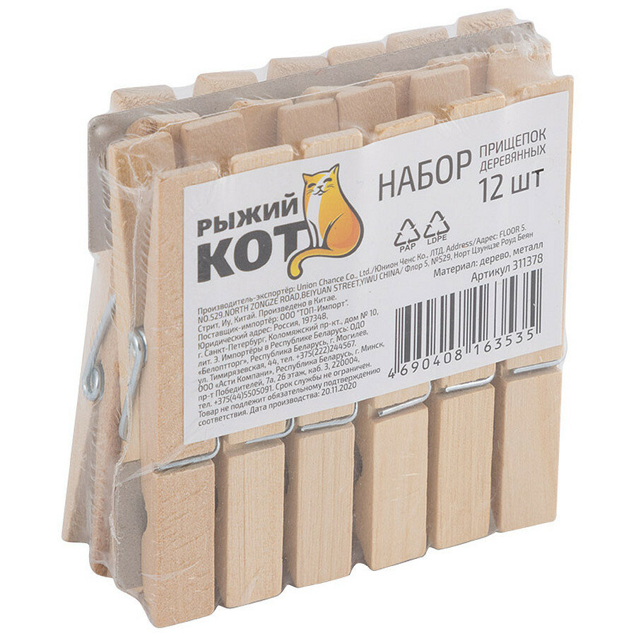 Набор бельевых прищепок Рыжий кот поможет содержать белье в чистоте и порядке даже при сильном ветре. Надежные прищепки понравятся каждой хозяйке. Предназначены для надежного крепления и сушки белья на улице и в помещении. Материал: дерево, металл; Длина прищепки: 73 мм; Количество: 12 шт.