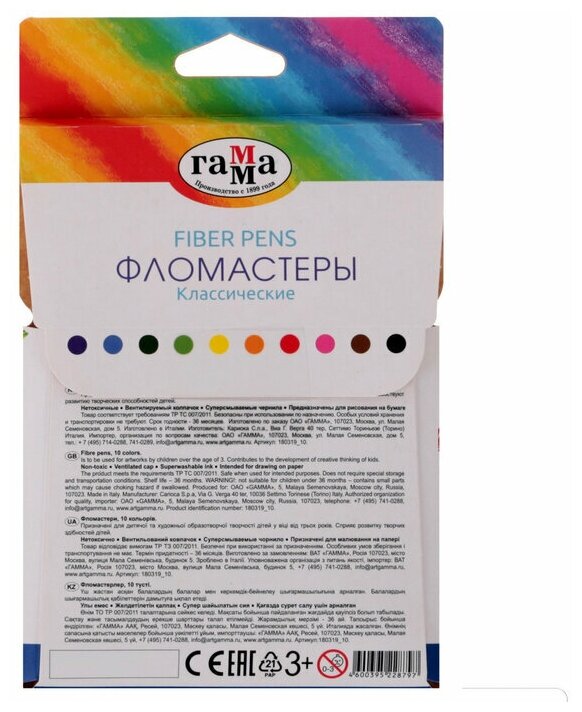 4493120 Фломастеры 10 цветов, "Гамма" "Классические" Фломастеры серии "Классическая" - это удобная упаковка-конверт, насыщенные цвета и тонкий наконечник, который позволяет наносить тонкие, четкие штрихи и развивать правильную технику рисования у детей. Чернила на основе воды и пищевых красителей, легко смываемые с одежды и рук, избавят от хлопот после рисования. Широкая цветовая палитра дает ребенку неограниченные возможности для творчества, развивая его художественные способности, а яркая, красочная упаковка может быть использована в качестве ориентира для воспроизведения ребенком.