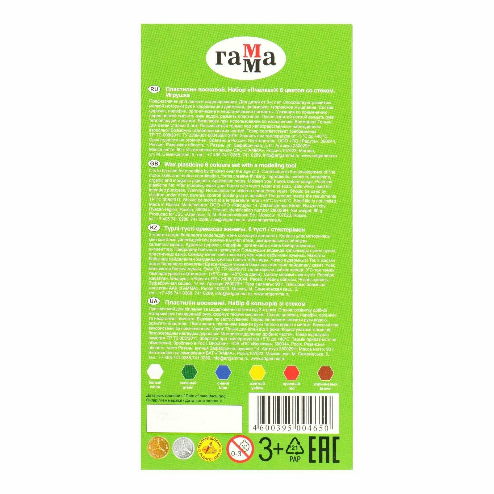 Пластилин мягкий (восковой), 6 цветов, 90 г, Гамма "Пчелка", со стекомЗнакомый и любимый пластилин в обновленном дизайне.* Разработан специально для детей от 3 до 6 лет — легко разминается, поэтому подходит для занятий самым маленьким.* Незаменим для развития мелкой моторики, подготовки кисти к письму.* Без выраженного химического запаха, не пачкает руки и рабочую поверхность.* Удобная упаковка с цветным выдвижным пеналом.