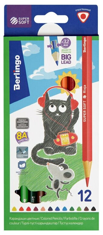 "SuperSoft" - линейка качественно новых цветных карандашей Berlingo. 12 цветов. Эргономичная трехгранная форма. Указание цвета на каждом карандаше на английском языке. Поле для подписи имени владельца на каждом карандаше. Упаковка в плотную матовую картонную коробку со склеенным европодвесом.