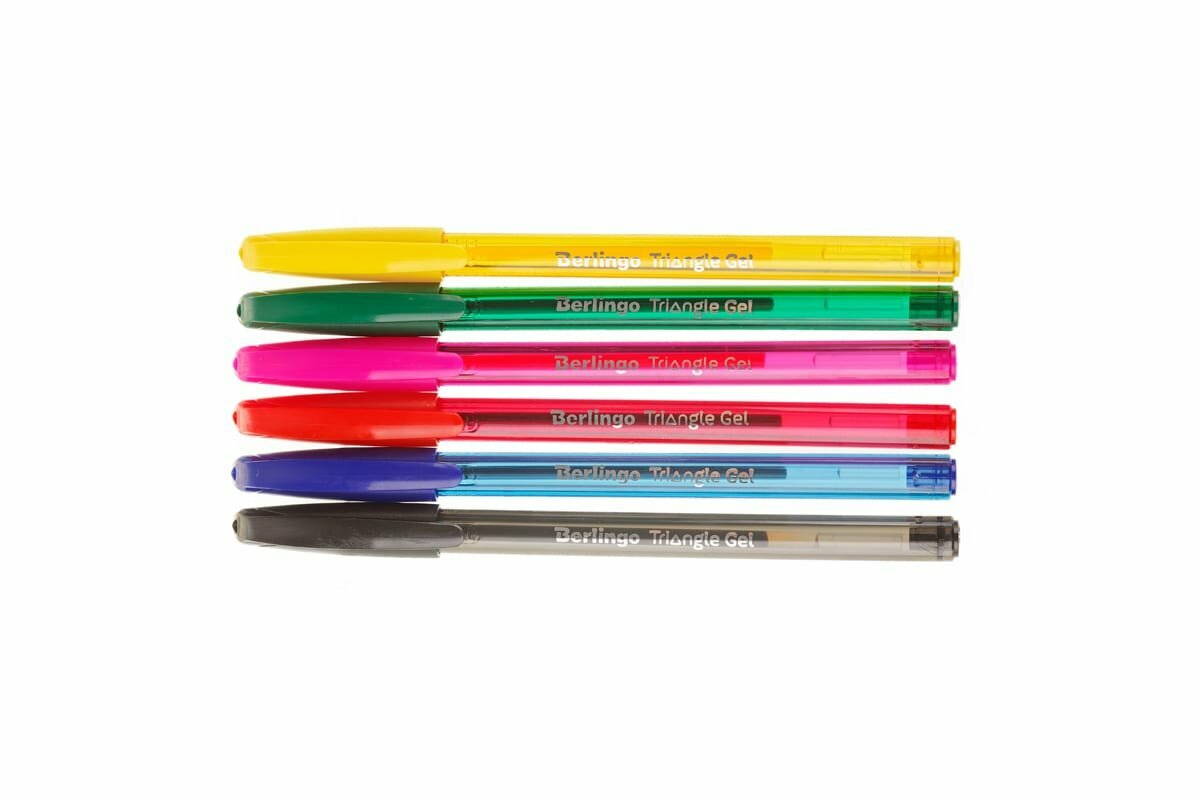Набор разноцветных гелевых ручек Berlingo Triangle Gel обладает чернилами с неоновым эффектом. Технология Quick Dry Ink обеспечивает быстрое высыхание чернил после нанесения на бумагу. Изделие обладает удобным корпусом трёхгранной формы и вентилируемым колпачком. Рифление в зоне захвата препятствует скольжению пальцев при письме, благодаря чему писать такой ручек можно быстро и легко. Цвет корпуса соответствует цвету чернил: чёрный, красный, зелёный, синий, жёлтый, розовый. Диаметр пишущего узла составляет 0,5 мм, благодаря чему получается тонкая, аккуратная линия. Толщина линии письма составляет 0,3 мм.