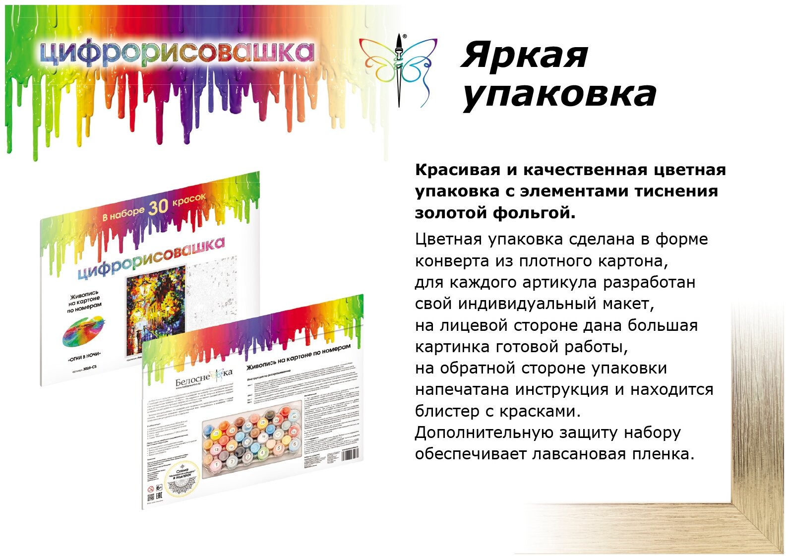 Наш ассортимент живописи на картоне по номерам постоянно пополняется! Торговая марка "Белоснежка" представляет прекрасные сюжеты форматом 30х40 см на картоне. Все наборы являются авторскими, разработанными по картинам современных художников, сотрудничающих с нашей компанией. Набор комплектуется акриловыми красками на водной основе, которые не имеют запаха и экологически безопасны. В качестве основы картины используется качественный картон с контурным рисунком размером 29,5х39,5, толщиной 2 мм.