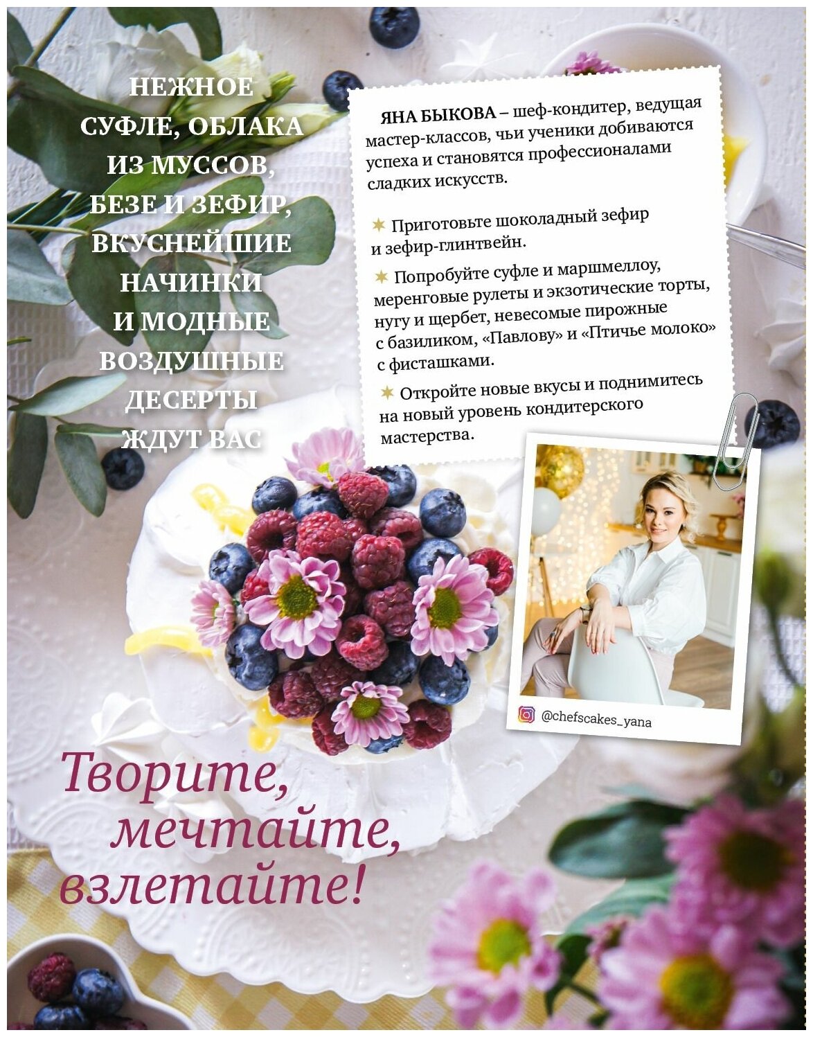 Хочется чего-то воздушного? Нежное суфле, облака из муссов, безе и зефир, вкуснейшие начинки и модные воздушные десерты ждут вас. Творите, мечтайте, взлетайте! Автор книги Яна Быкова (@chefcakes_yana) - шеф-кондитер, ведущая мастер-классов, чьи ученики добиваются успеха и становятся профессионалами сладких искусств. Приготовьте шоколадный зефир и зефир-глинтвейн. Попробуйте суфле и маршмеллоу, меренговые рулеты и экзотические торты, нугу и щербет, невесомые пирожные с базиликом, "Павлову" и "Птичье молоко" с фисташками. Откройте новые вкусы и поднимитесь на новый уровень кондитерского мастерства.