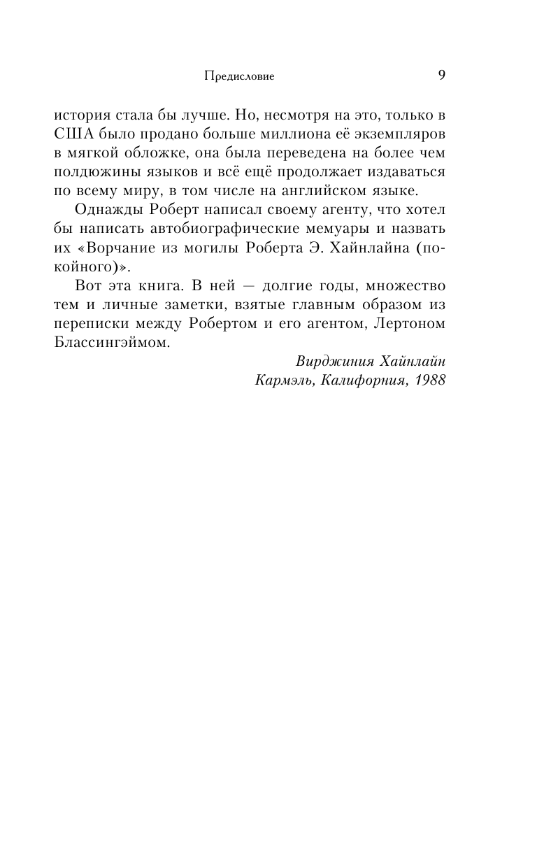 Роберт Хайнлайн – отец современной фантастики. Грандмастер премии "Небьюла" и многократный лауреат премии "Хьюго". Самый влиятельный, популярный и противоречивый автор – создатель лиричной "Двери в лето" и таких разных книг, как милитаристский "Звездный десант" и гуманистический "Чужак в стране чужой". Перед вами автобиография, в которой Хайнлайн предстает живым человеком, со своими страстями и конфликтами, с невзгодами и победами. Откроется его личная жизнь, политические, социальные и религиозные взгляды. Вы проследите за творческим процессом и эволюцией стиля, получите уроки мастерства от величайшего писателя-фантаста. Книга была тщательно собрана из личной переписки автора с редакторами, агентами, друзьями и коллегами-фантастами и отредактирована женой писателя – Вирджинией Хайнлайн.