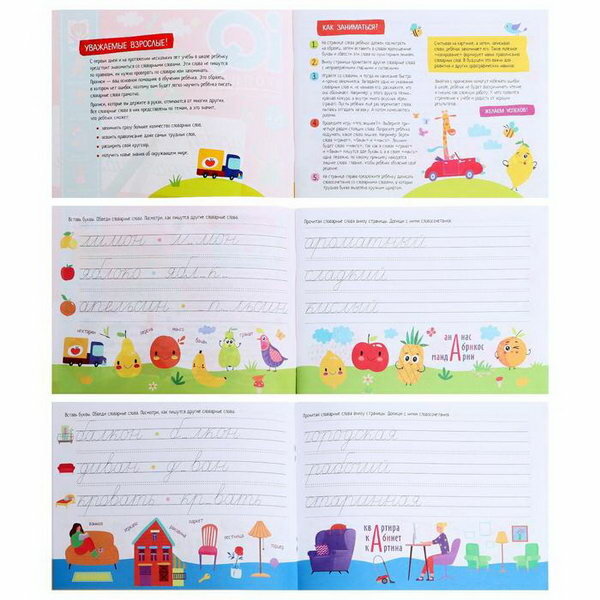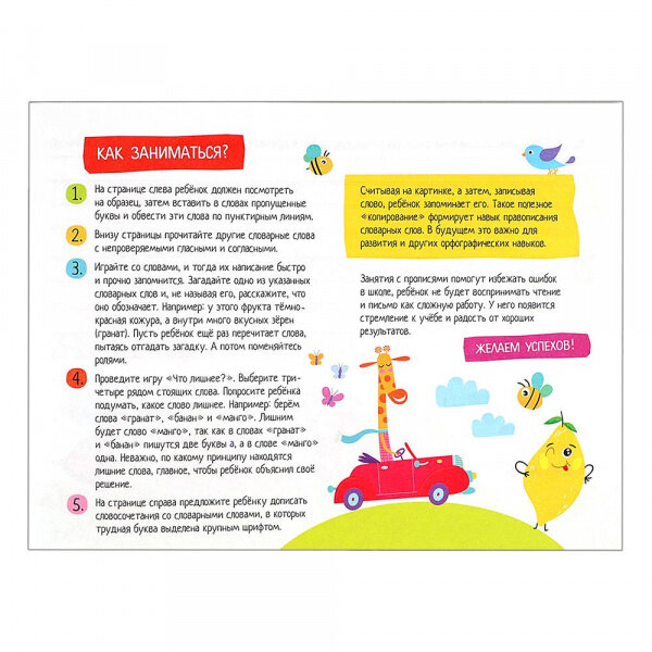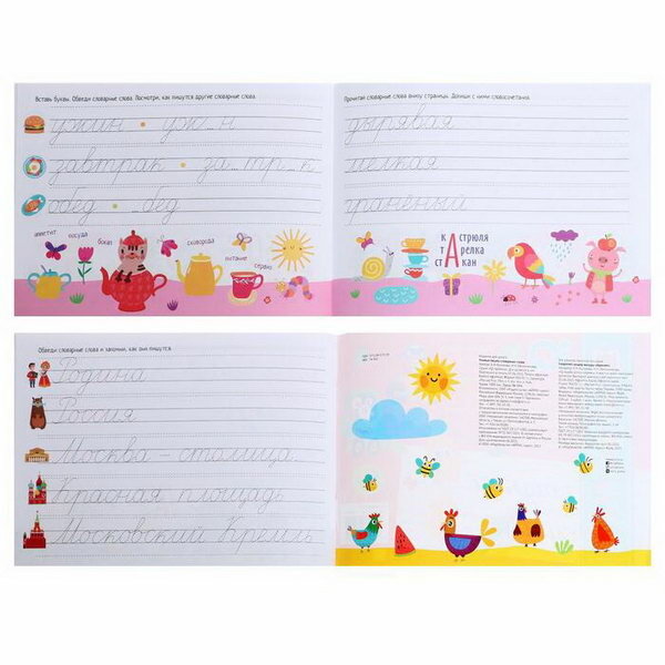 В этих прописях ребёнок сможет обводить, писать и таким образом легко запомнить более 300 словарных слов. Благодаря такой непринуждённой тренировке ребёнок научится легко преодолевать ошибкоопасные места в словах. Задания в прописях помогут подготовить руку ребёнка к письму, научат его ровно писать на строчках и как результат сформировать красивый почерк. К тому же работа в прописях хорошо развивает словарный запас.