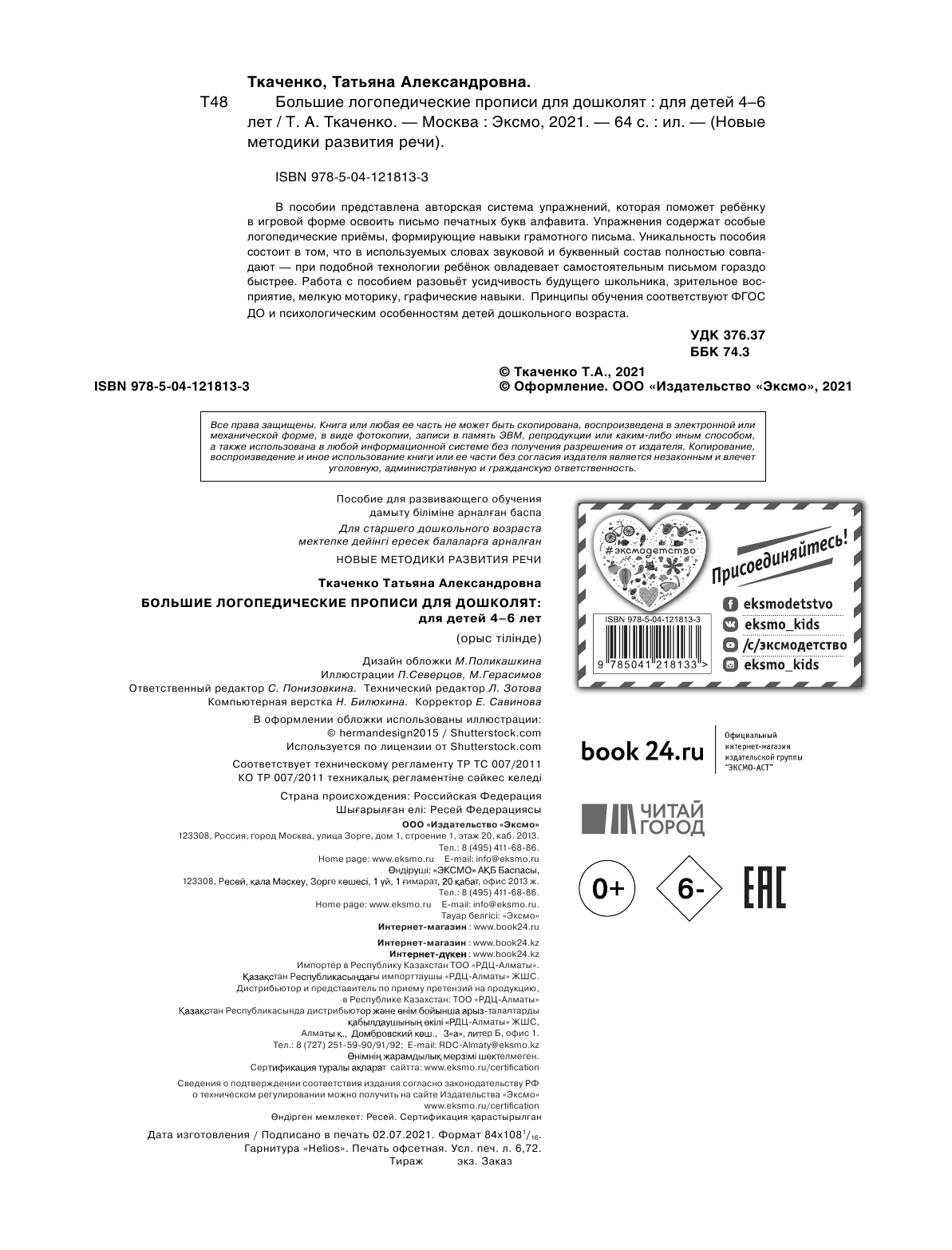 Большие логопедические прописи для дошколят (Ткаченко Татьяна Александровна); ООО "Издательство "Эксмо", 2021