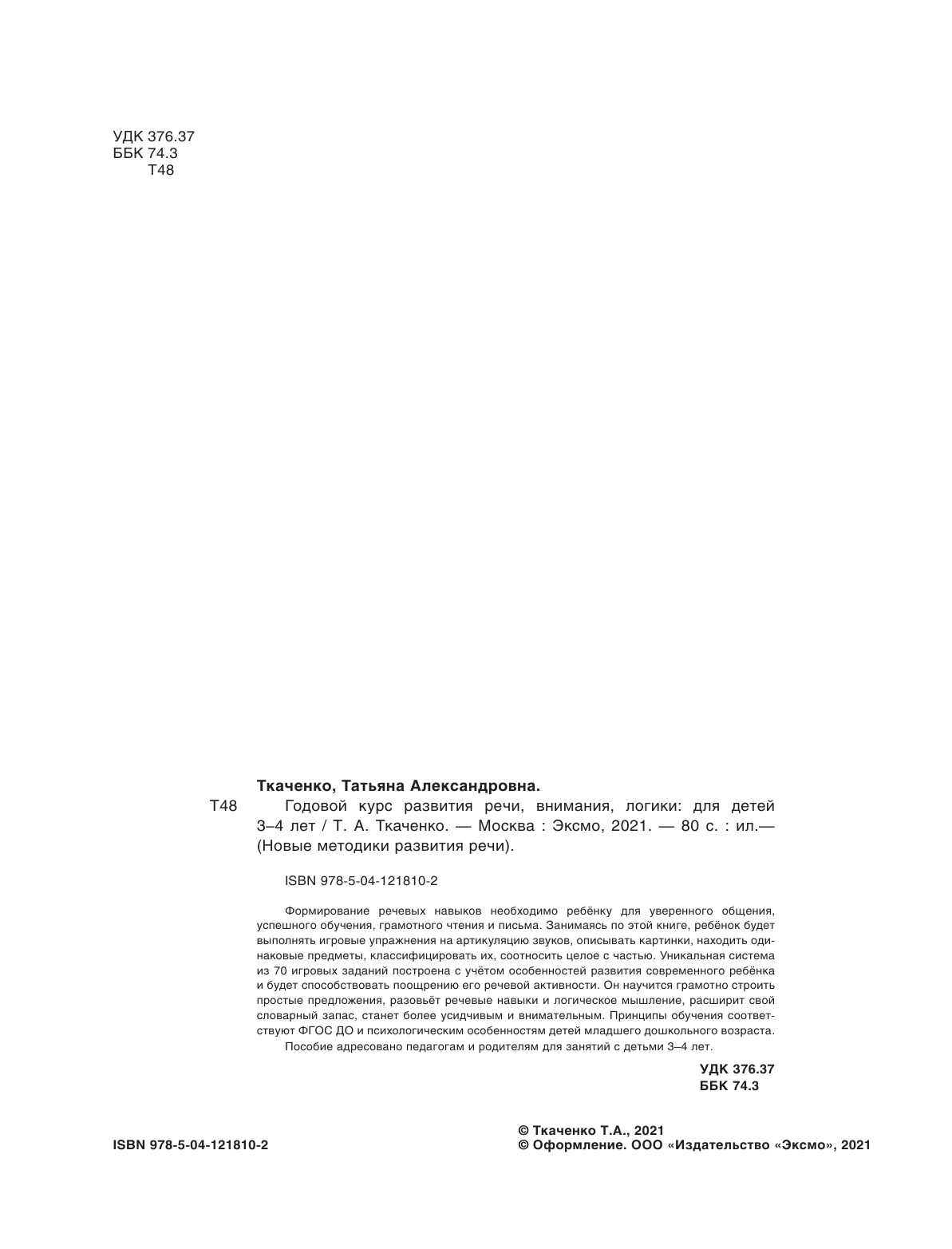 Годовой курс развития речи внимания логики: для детей 3-4 лет (Ткаченко Татьяна Александровна); ООО "Издательство "Эксмо", 2021