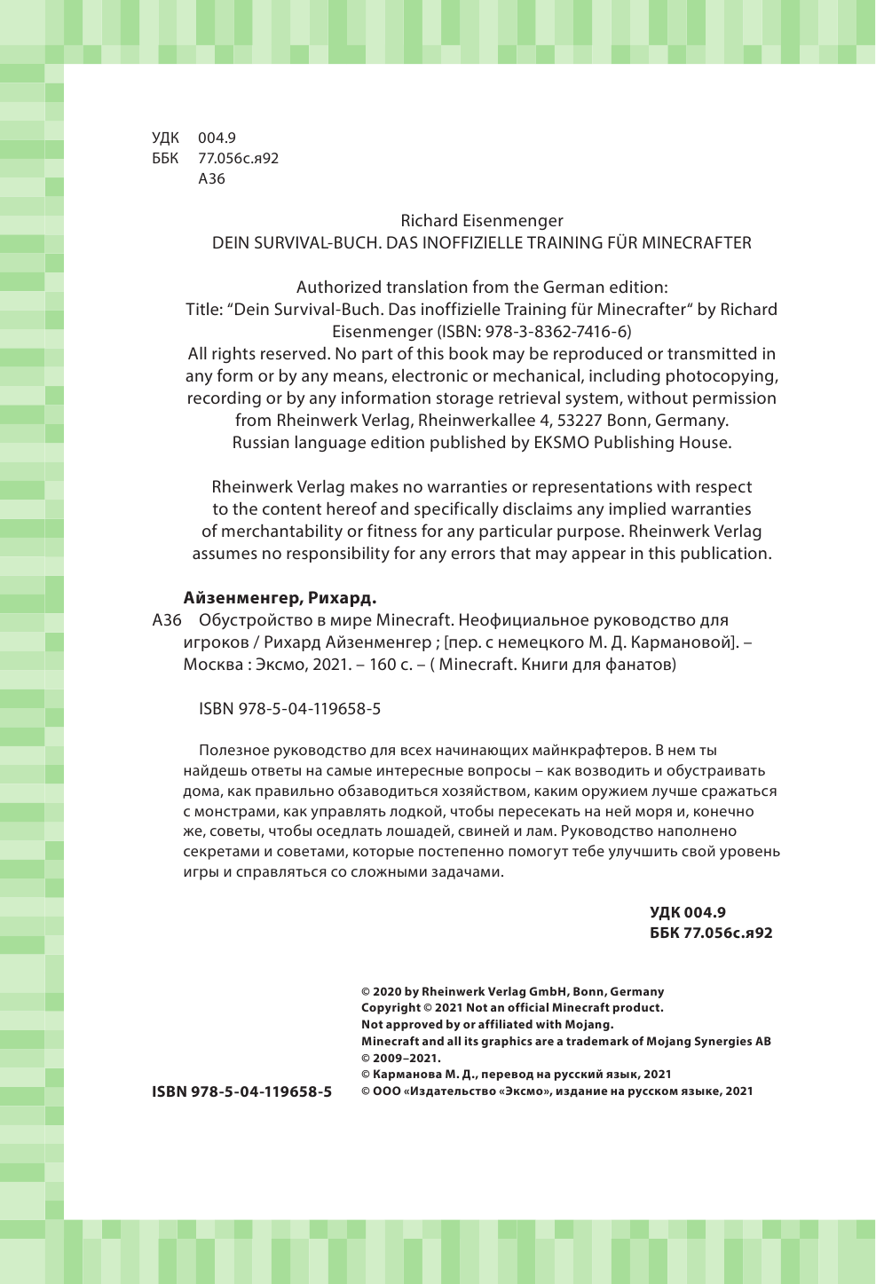 Обустройство в мире Minecraft. Неофициальное руководство для игроков (Айзенменгер Рихард); ООО "Издательство "Эксмо", 2021