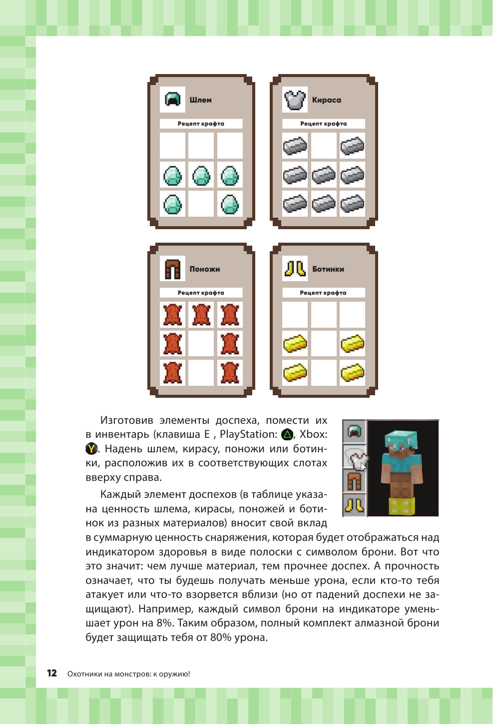 Полезная книга для любителей Майнкрафта – много советов про оружие, хозяйство, транспорт. Плюс есть алгоритмы создания предметов и материалов. С помощью указателя можно легко найти нужную информацию. Много иллюстраций для наглядности, бумага приятная. Издание пригодится как новичкам, так и опытным пользователям, желающим повысить свою эффективность))