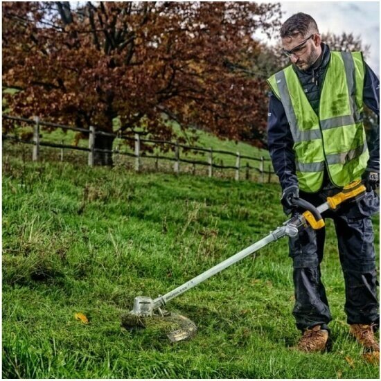 Аккумуляторная коса Dewalt XR 18 В BRUSHLESS применяется для стрижки газона на частном участке. Штанга имеет складываемый кронштейн для удобства хранения.