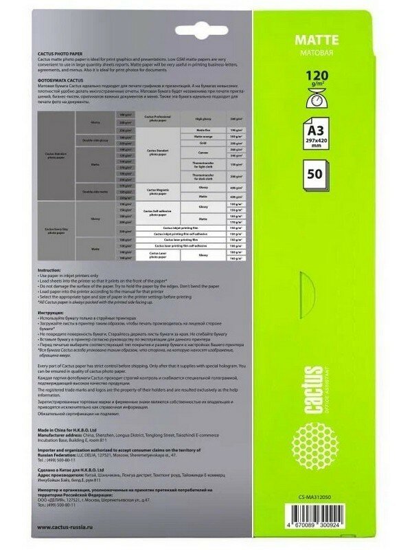 Фотобумага Cactus A3/120г/м2/50л./белый матовое для струйной печати CS-MA312050