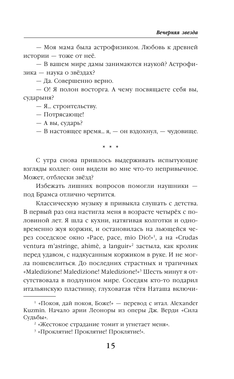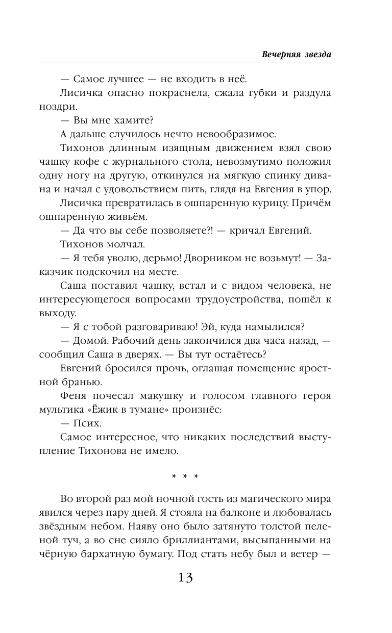 «Вечерняя звезда» - книга о путешествие в мир сказок, она легка и ненавязчива , читается на одном дыхании. Советую почитать, если хотите прочесть новое интересное трактование «золушки», «красавицы и чудовище» и многих других историй. Очень много жизненных шуток добавляет этой истории антуража реалистичности.