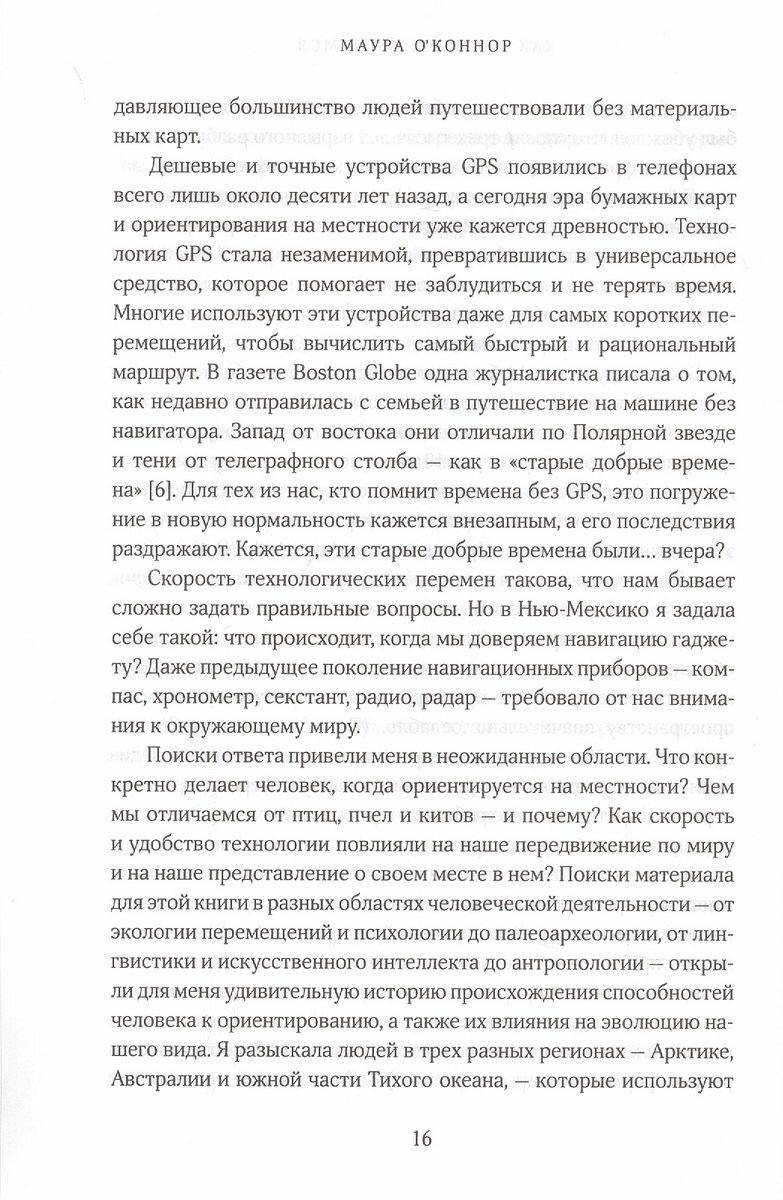 "Я спросила себя: что происходит, когда мы доверяем навигацию гаджету? Даже предыдущее поколение навигационных приборов - компас, хронометр, секстант, радио, радар - требовало от нас внимания к окружающему миру. Поиски ответа привели меня в неожиданные области. Что конкретно делает человек, когда ориентируется на местности? Чем мы отличаемся от птиц, пчел и китов - и почему? Как скорость и удобство технологии повлияли на наше передвижение по миру и на наше представление о своем месте в нем? Поиски материала для этой книги в разных областях человеческой деятельности - от экологии перемещений и психологии до палеоархеологии, от лингвистики и искусственного интеллекта до антропологии - открыли для меня удивительную историю происхождения способностей человека к ориентированию, а также их влияния на эволюцию нашего вида". (Маура О'Коннор)