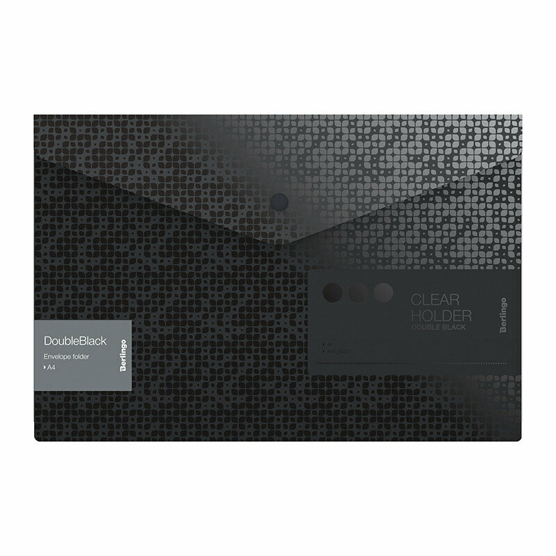 Папка-конверт пластиковая на кнопке Berlingo "DoubleBlack" формата А4 черного цвета с рельефным рисунком UV-лаком. Черный цвет внутренней поверхности. Надежная застежка-кнопка черного цвета. Быстрый доступ к документам. Изготовлена из высококачественного полипропилена с матовой текстурой поверхности "песок", на которой не видно отпечатков пальцев и мелких царапин. Предназначена для хранения документов. Толщина 180 мкм. Вмещает до 120 листов.