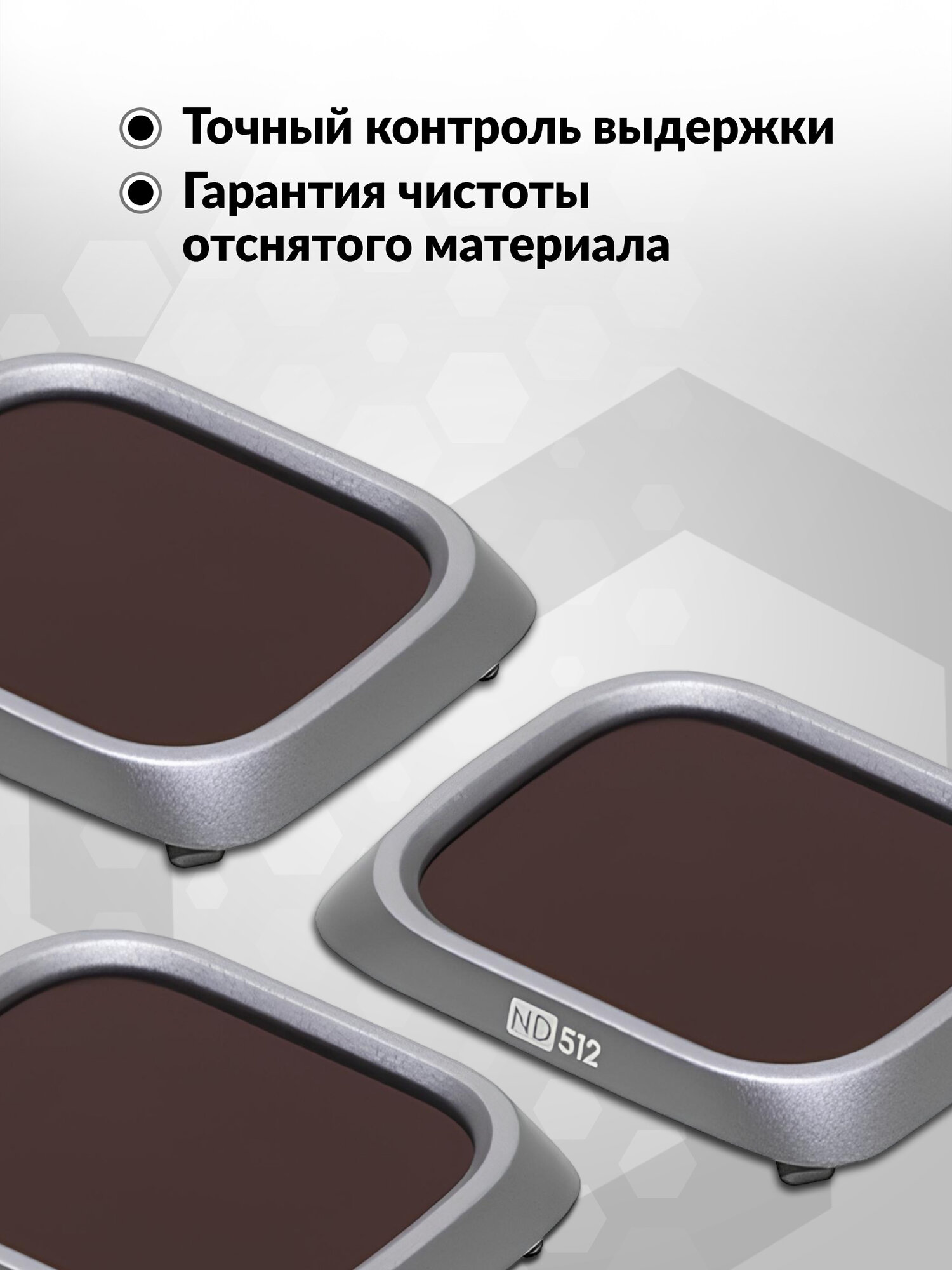 Эти высококачественные светоподавляющие нейтральные фильтры предоставляют опытным пользователям точный контроль выдержки и гарантируют чистоту отснятого материала даже при открытии затвора на 180° с низким ISO во время записи.