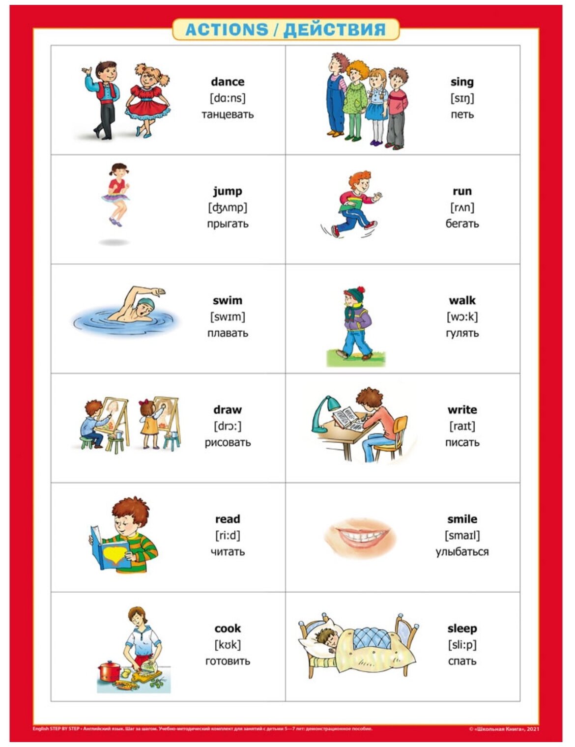 Пособие предназначено для введения новых слов посредством картинок. Работа по нему проводится следующим образом: вы называете слова по порядку, показываете соответствующие картинки, а дети повторяют слова за вами. В процессе усвоения лексики задания разнообразятся и постепенно усложняются: вы называете слова не по порядку, произносите их по-русски, а дети — по-английски; показываете картинку и просите назвать её и т. п. Пошаговый примерный ход каждого занятия подробно описывается в методическом пособии, которое рекомендуем использовать вместе с демонстрационным пособием на протяжении всего учебного курса.