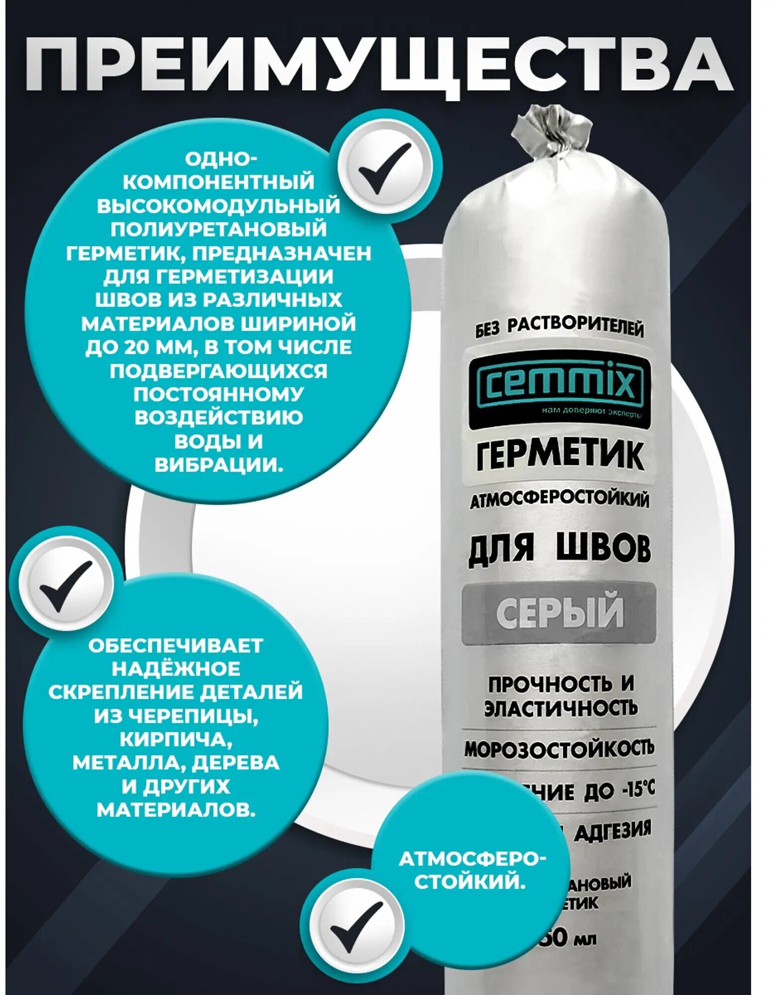 Полиуретановый герметик Cemmix предназначен для заполнения швов, примыканий, мест ввода труб, а также для склеивания различных изделий из дерева и металла. Может использоваться для внутренних и наружных работ разного назначения ? от гидроизоляции доукладки керамической черепицы. Подходит для работы с деревом и металлом.