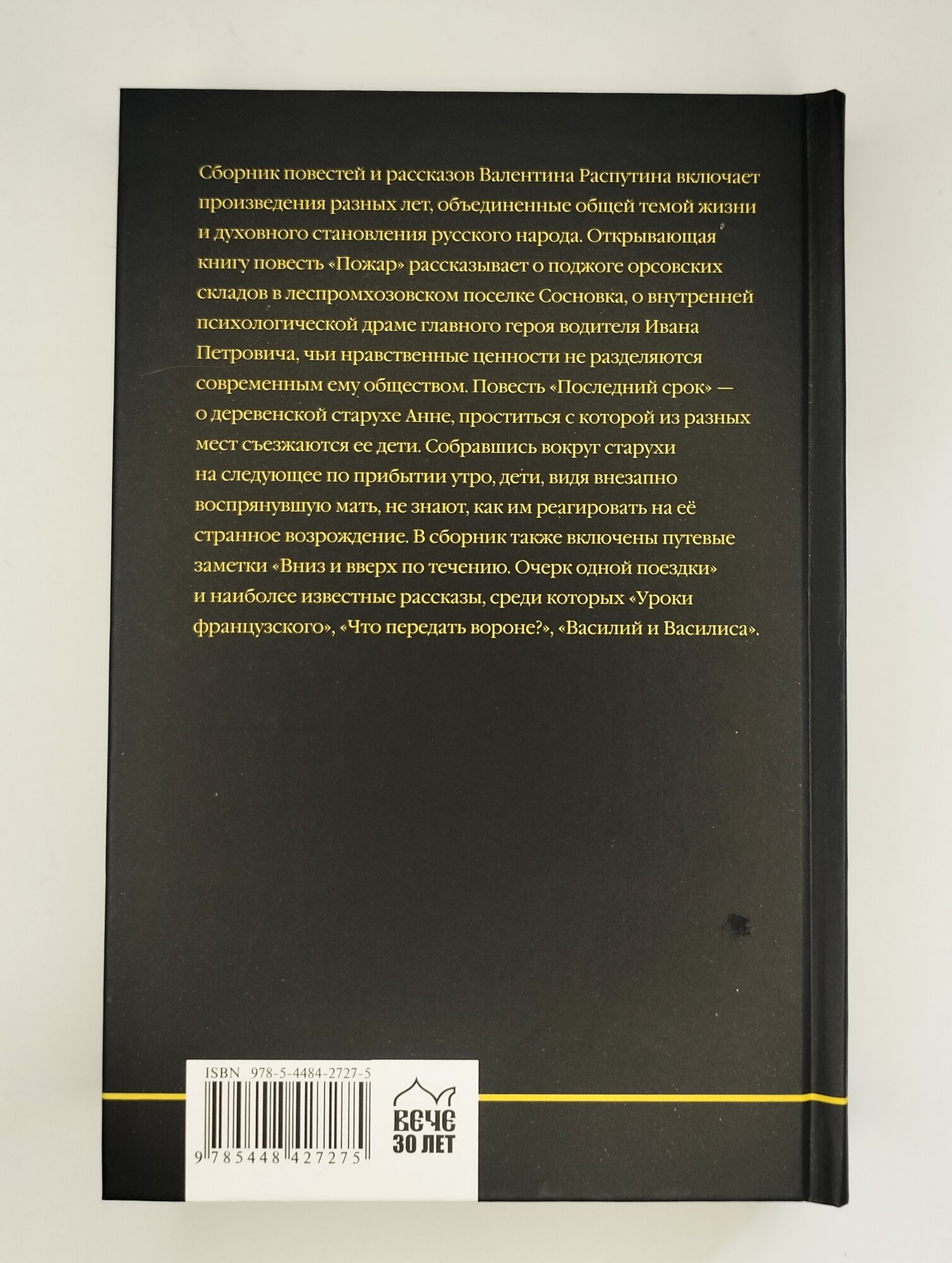 Сборник повестей и рассказов Валентина Распутина включает произведения разных лет, объединенные общей темой жизни и духовного становления русского народа. Открывающая книгу повесть «Пожар» рассказывает о поджоге орсовских складов в леспромхозовском поселке Сосновка, о внутренней психологической драме главного героя водителя Ивана Петровича, чьи нравственные ценности не разделяются современным ему обществом. Повесть «Последний срок» — о деревенской старухе Анне, проститься с которой из разных мест съезжаются ее дети. Собравшись вокруг старухи на следующее по прибытии утро, дети, видя внезапно воспрянувшую мать, не знают, как им реагировать на её странное возрождение. В сборник также включены путевые заметки «Вниз и вверх по течению. Очерк одной поездки» и наиболее известные рассказы, среди которых «Уроки французского», «Что передать вороне?», «Василий и Василиса».