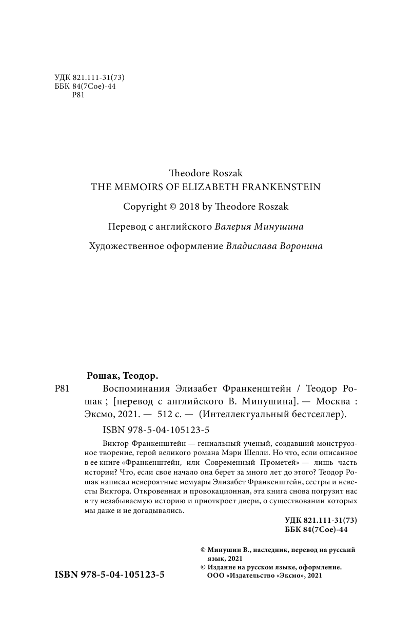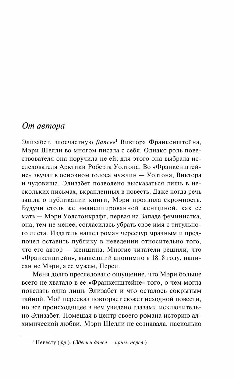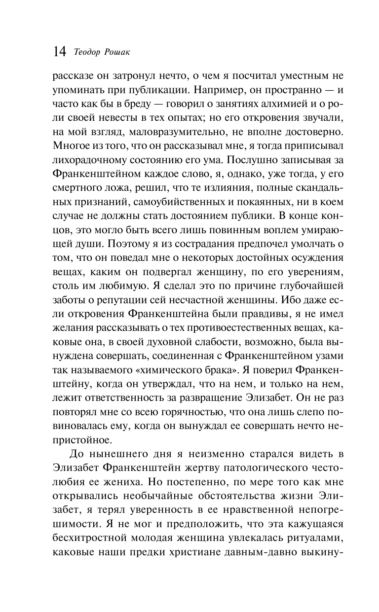 Виктор Франкенштейн - гениальный ученый, создавший монструозное творение. Но что, если его жизнь и перипетии - всего часть большой истории? Что, если свое начало она берет за много лет до этого? Теодор Рошак написал невероятные мемуары Элизабет Франкенштейн, сестры и невесты Виктора. Откровенная и провокационная, эта книга приоткроет двери, о существовании которых мы даже и не догадывались.