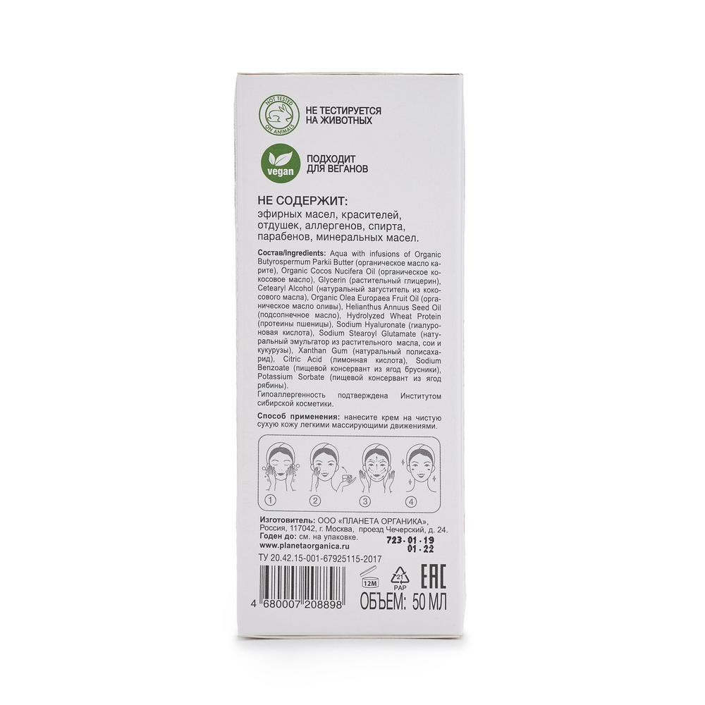 | Состав | Aqua with infusions of Organic Butyrospermum Parkii Butter (органическое масло карите), Organic Cocos Nucifera Oil (органическое кокосовое масло), Glycerin (растительный глицерин), Cetearyl Alcohol (натуральный загуститель из кокосового и пальмового масел), Organic Olea Europaea Fruit Oil (органическое масло оливы), Helianthus Annuus Seed Oil (подсолнечное масло), Hydrolyzed Wheat Protein (протеины пшеницы), Sodium Hyaluronate (гиалуроновая кислота), Sodium Stearoyl Glutamate (натуральный эмульгатор из растительного масла, сои и кукурузы), Xanthan Gum (натуральный полисахарид), Citric Acid (лимонная кислота), Sodium Benzoate (пищевой консервант из ягод брусники), Potassium Sorbate (пищевой консервант из ягод рябины) |