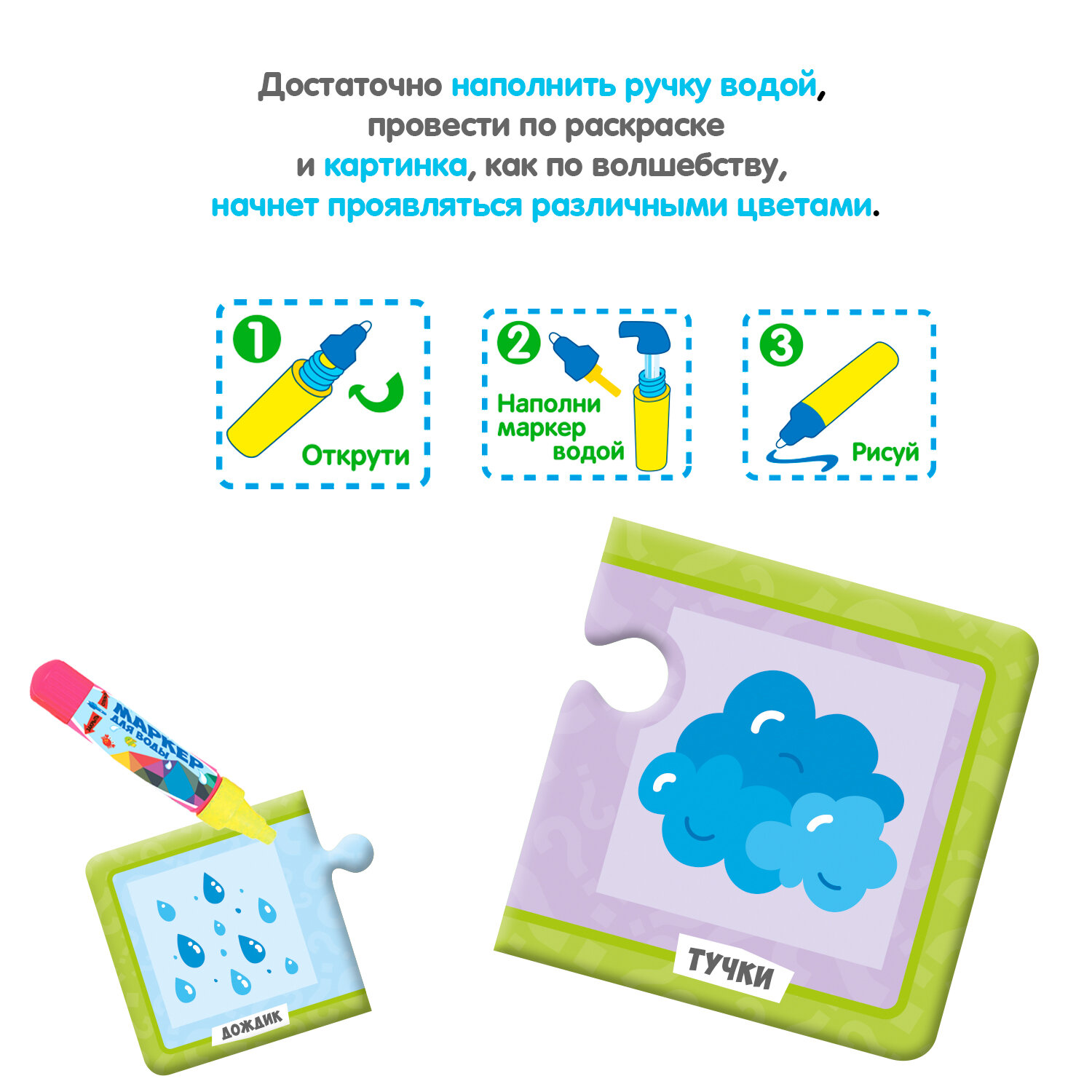 Водная раскраска послужит увлекательным занятием даже для тех, кто еще совсем не умеет рисовать. Достаточно наполнить ручку водой и провести по раскраске, и картинка, как по волшебству, начнёт проявляться различными цветами. После высыхания картинка опять становится бесцветной, и ребенок снова может раскрашивать её. Пазлы развивают образное и логическое мышление, наблюдательность и внимательность, а также мелкую моторику и координацию движений рук.