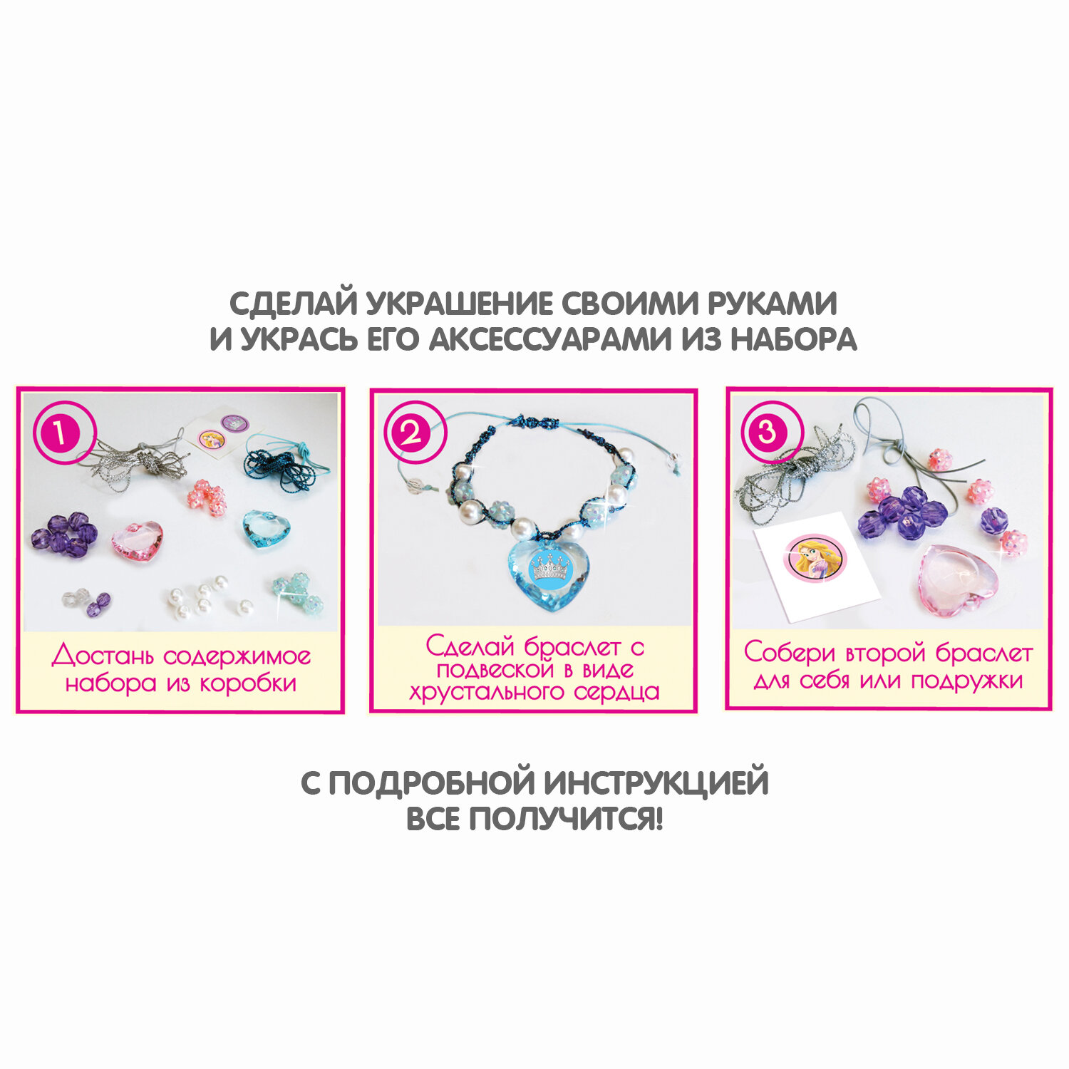 Каждая девочка мечтает почувствовать себя особенной! В наборе есть бусины, наклейки, подвески и цветные нити для создания двух нежных браслетов для маленькой принцессы.