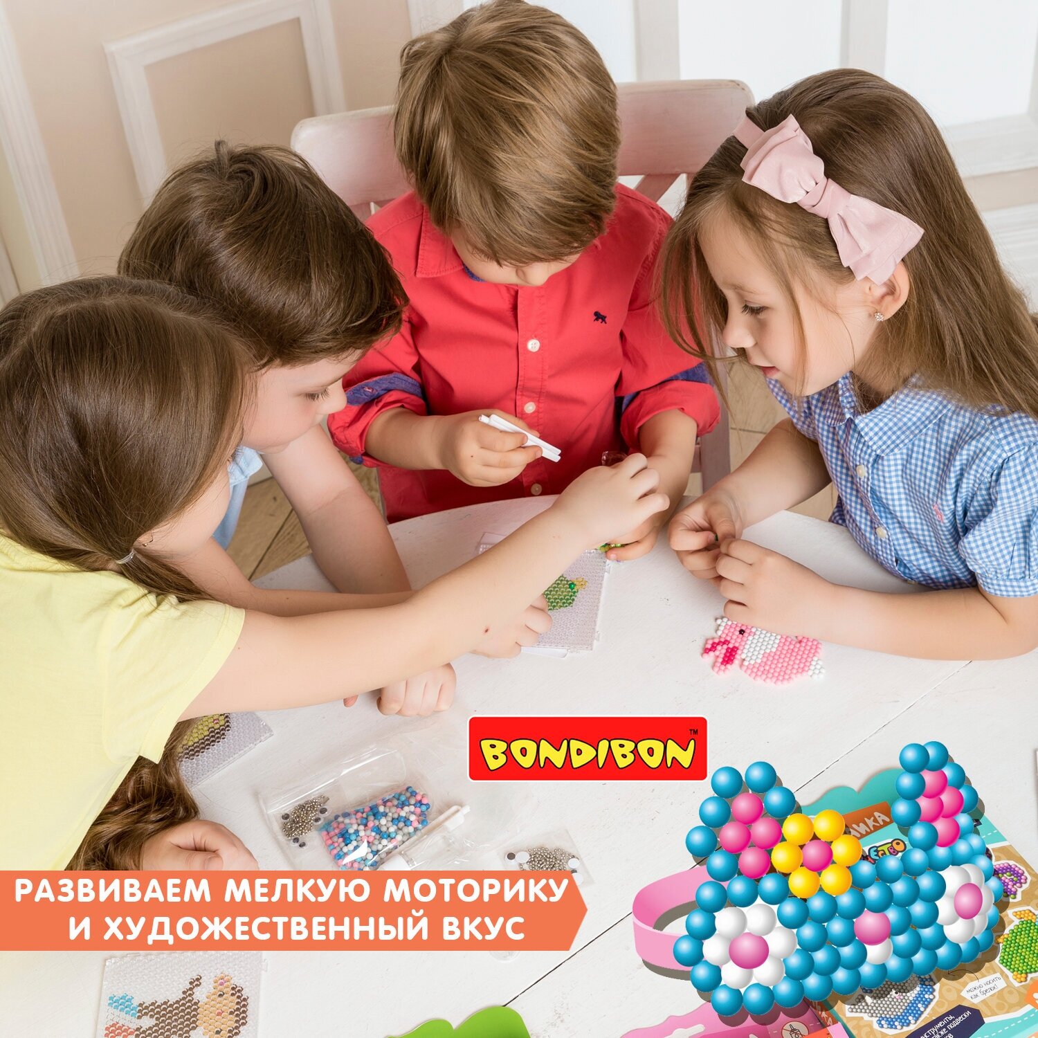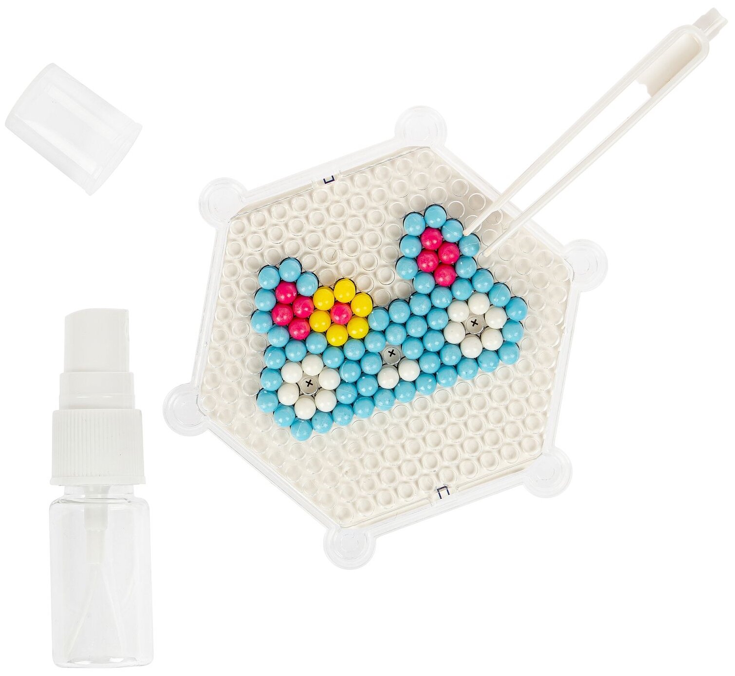 Разложите цветные шарики по трафарету, слегка смочите их водой, дайте им высохнуть и готовая фигурка из бусин застынет!