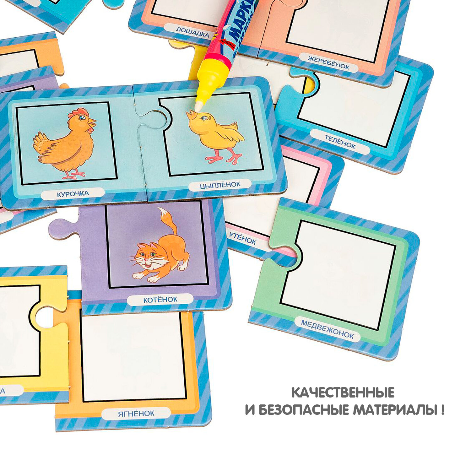 Но это ещё не всё! Ребёнку нужно подобрать каждой картинке соответствующую картинку по форме и по смысловому значению, как в играх лото. Ребенок изучет домашних животных, учится определять какому животному принадлежит детеныш.