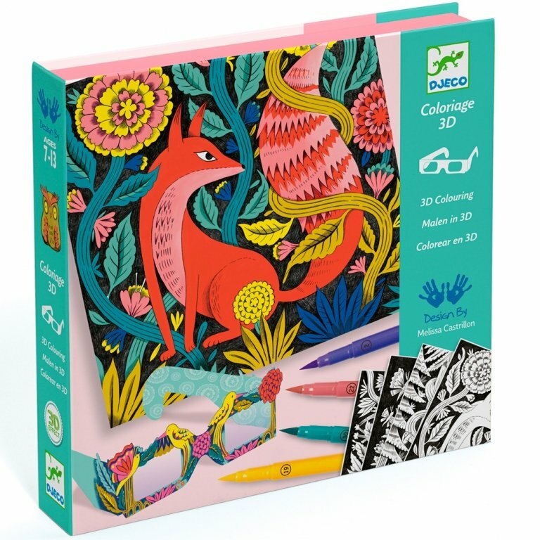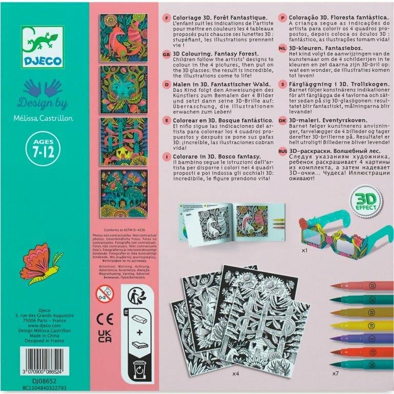 В набор входят 4 картинки для раскрашивания, 7 фломастеров и 3D очки.