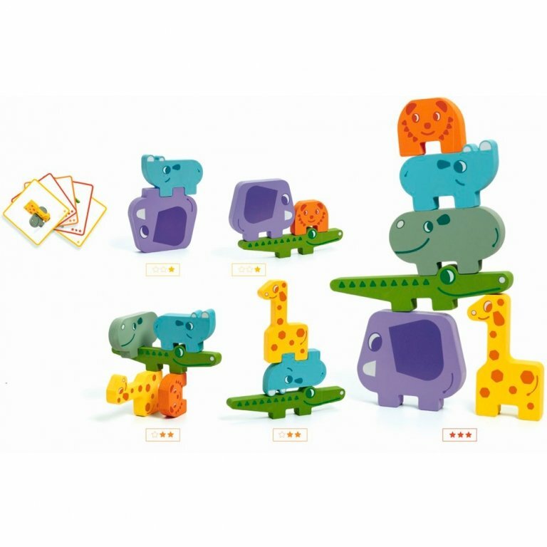 В комплекте: 20 карточек с заданиями разного уровня сложности, 6 деревянных фигурок животных для строительства разных пирамидок