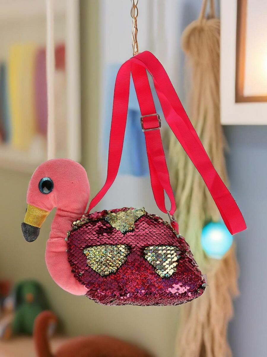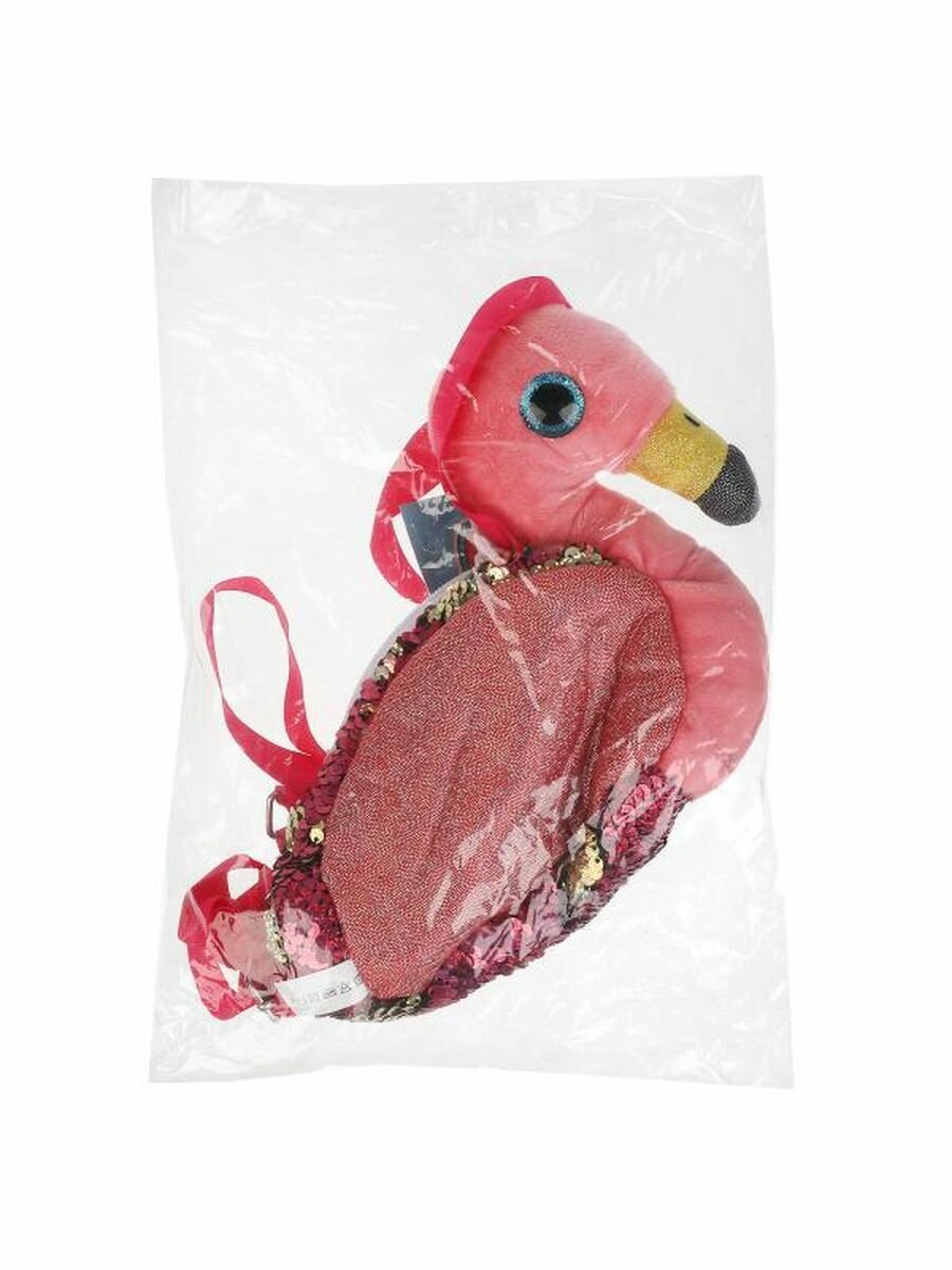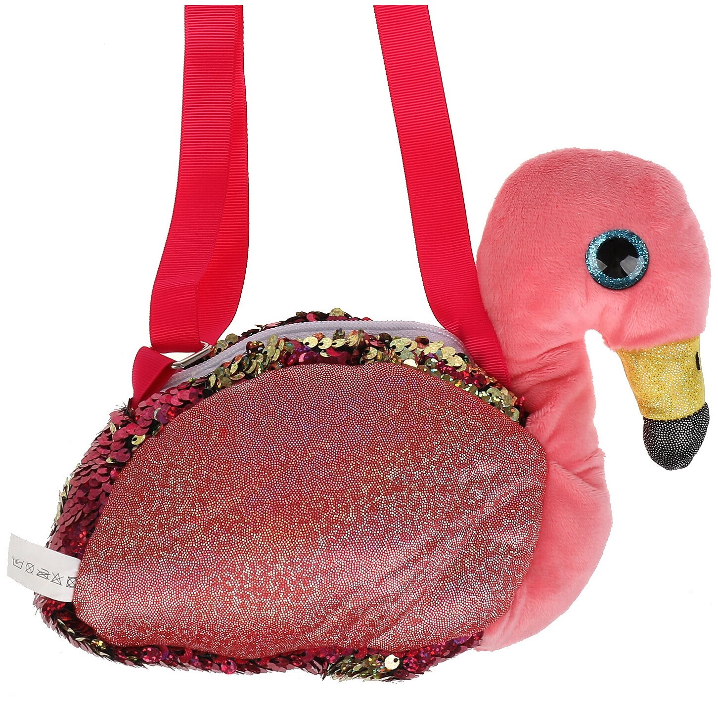 Этот очаровательный розовый фламинго с голубыми глазами и золотистым клювом - не только милая игрушка, но и стильная сумочка. Сумка декорирована пайетками, красиво переливающимися на свету, ручка выполнена из материала розового цвета. С этой сумочкой ваша малышка сможет брать с собой на прогулку все самое необходимое.