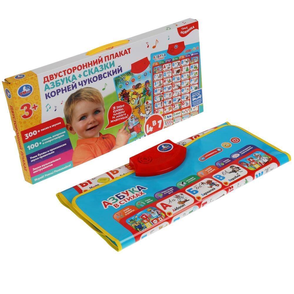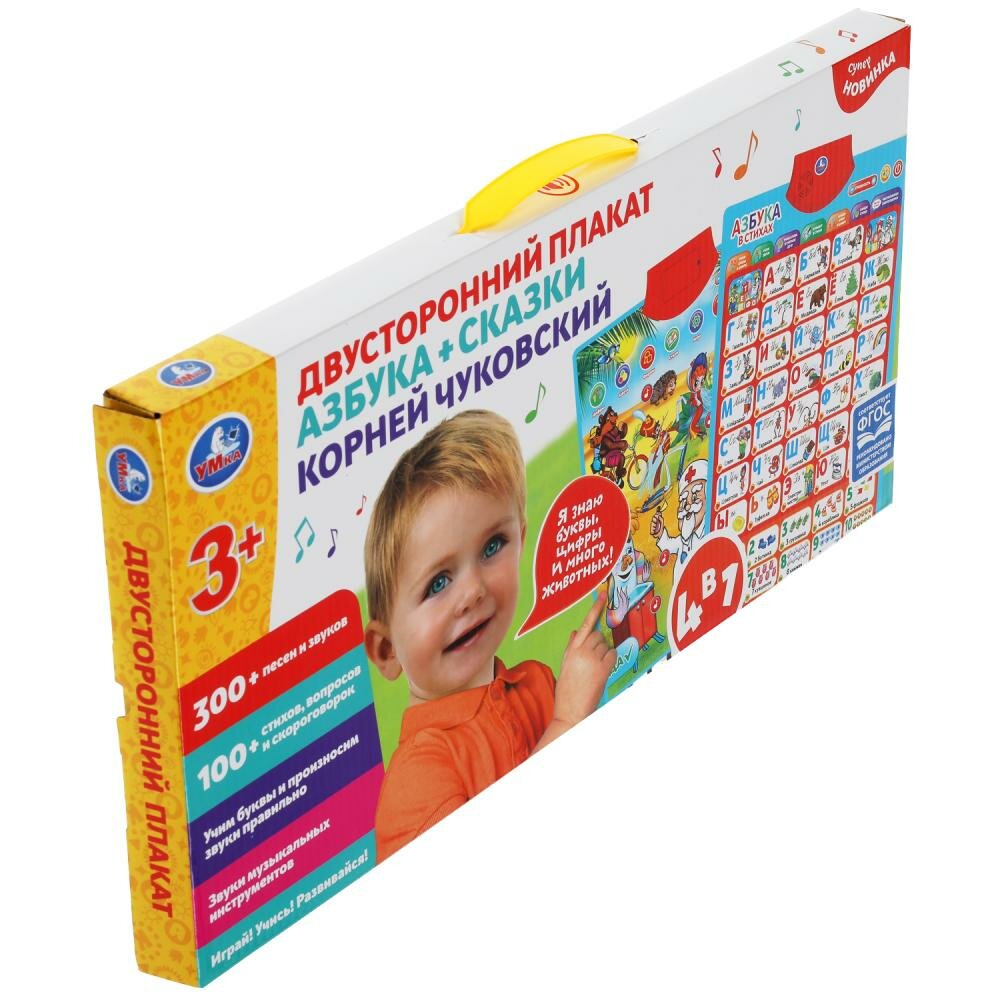 Двусторонний обучающий плакат 4 в 1 К. Чуковский Азбука + сказки ТМ УМка порадует вашего ребенка красочным дизайном и своим функционалом.