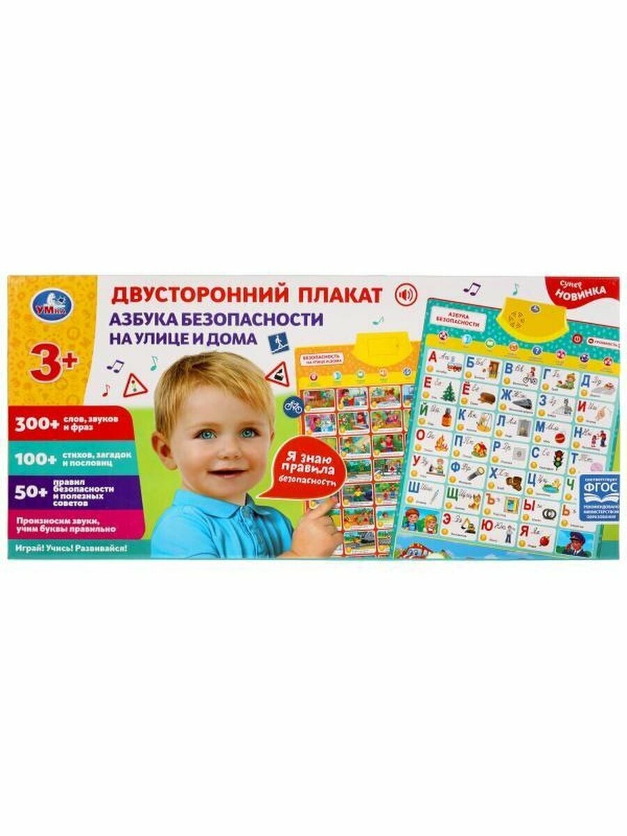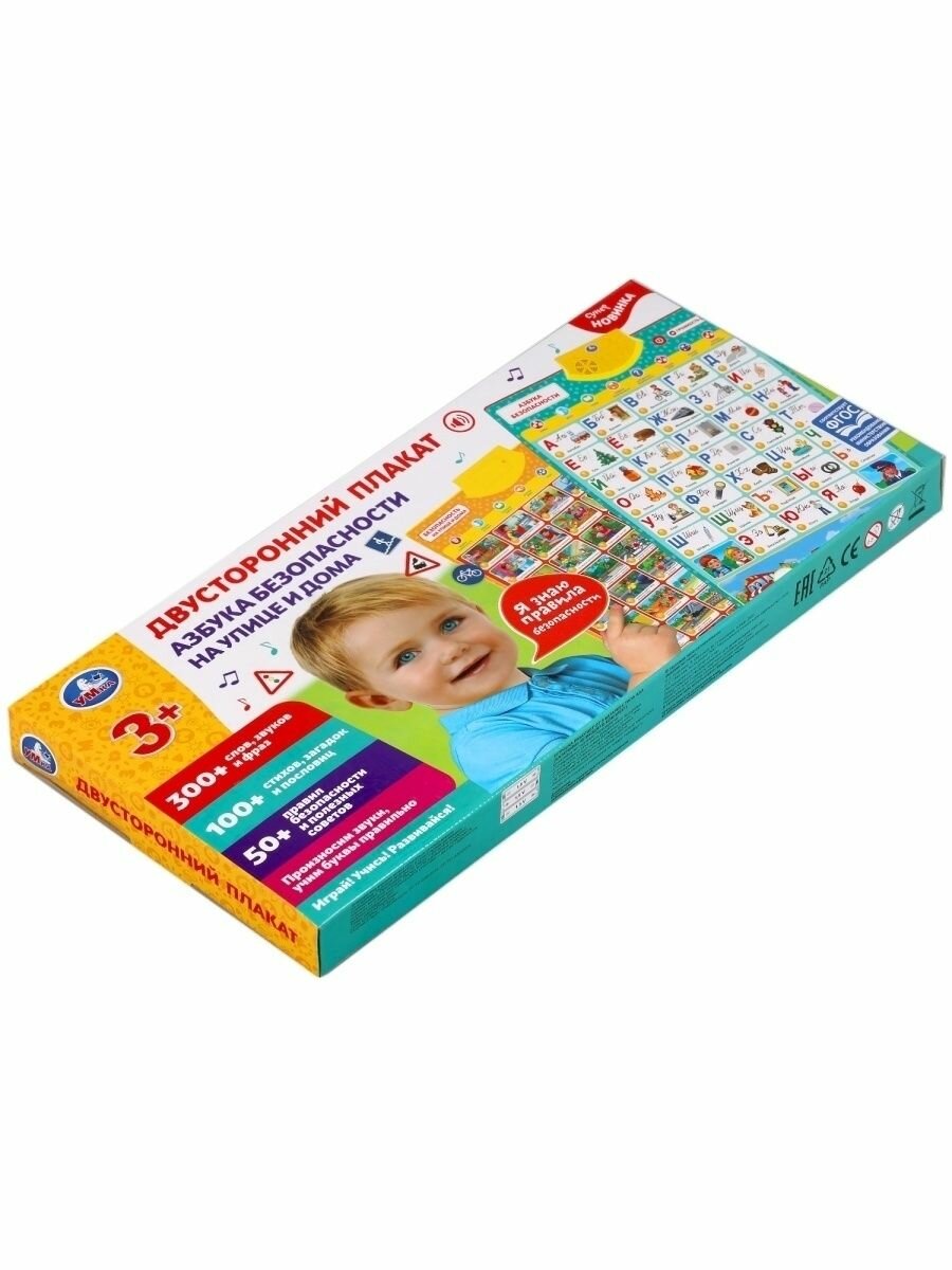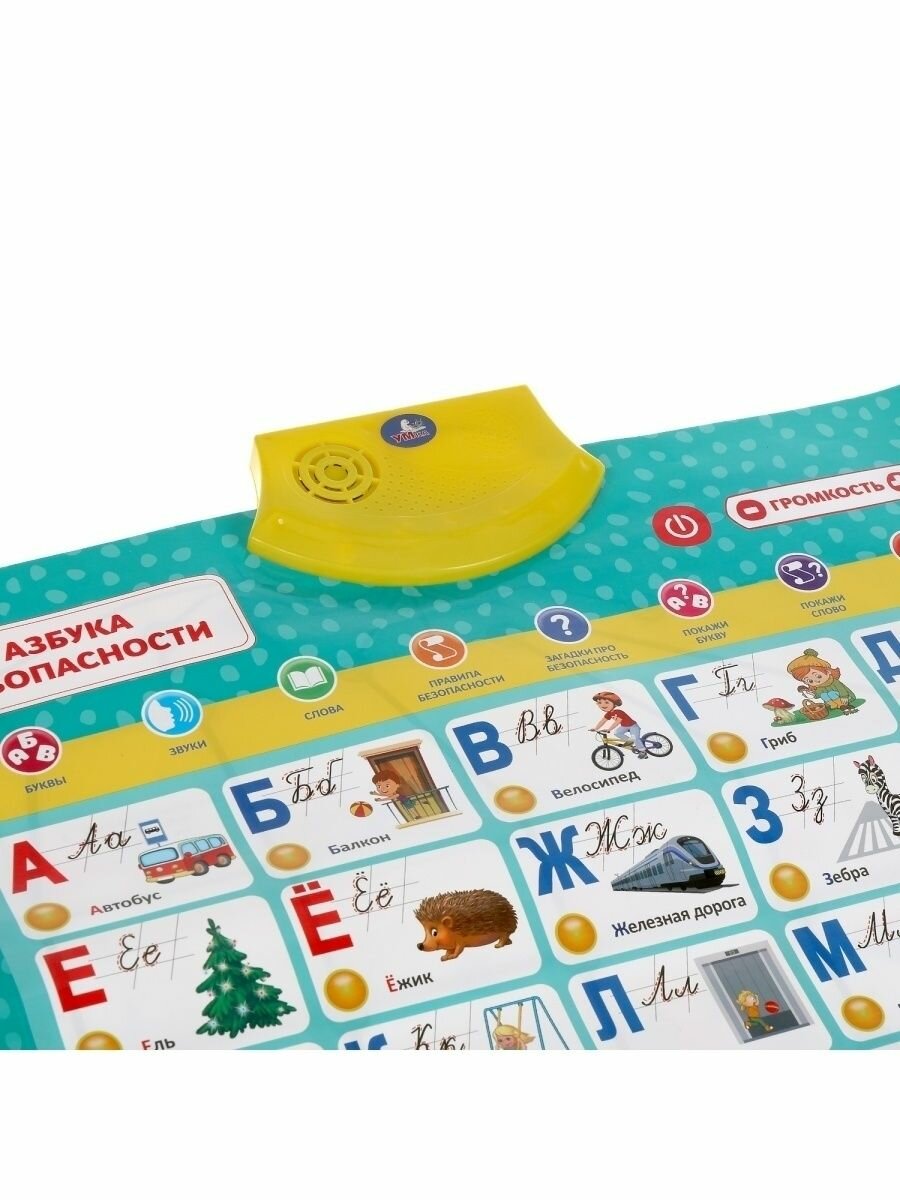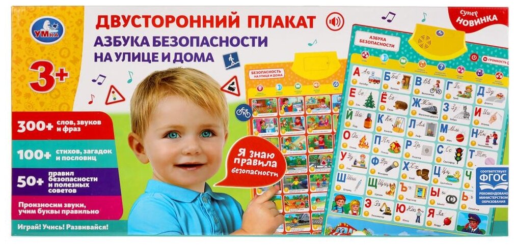 Полезная база для обучения ребёнка в виде обучающего плаката. Преподнесённую в визуальном и звуковом форматах информацию ребёнку будет проще усвоить и запомнить. Малыш с удовольствием будет нажимать на разнообразные кнопки и в лёгкой игровой форме знакомиться с буквами, слогами, словами и правилами безопасности на улице и дома.