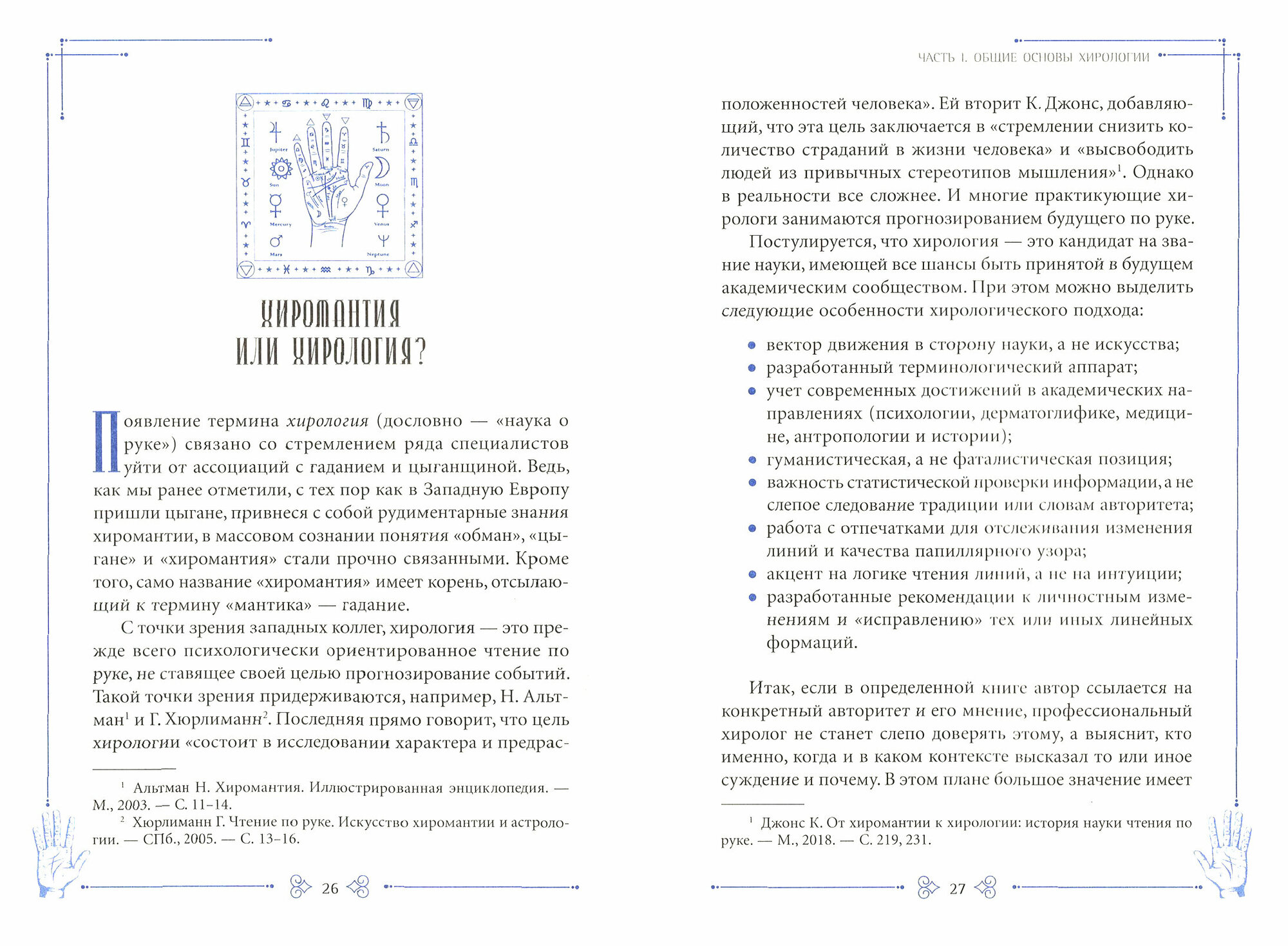 Одна из лучших книг по хирологии ,хиромантии ,освещающая современный подход.Прекрасные исторические отсылы к корифеям хиромантии.Даны отсчеты времени по линиям руки и методы коррекции .Такого конкретного материала нет ни в одной современной книги по хиромантии.Огромное спасибо ото всех практикующих хирологов составителям книги за такую щедрую информацию!Всем советую.