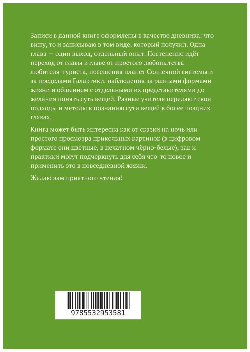 Записи в данной книге оформлены в качестве дневника: что вижу, то и записываю в том виде, который получил. Одна глава – один выход, отдельный опыт. Постепенно идёт переход от главы к главе от простого любопытства любителя-туриста, посещения планет Солнечной системы и за пределами Галактики, наблюдения за разными формами жизни и общением с отдельными их представителями до желания понять суть вещей. Разные учителя передают свои подходы и методы к познанию сути вещей в более поздних главах.