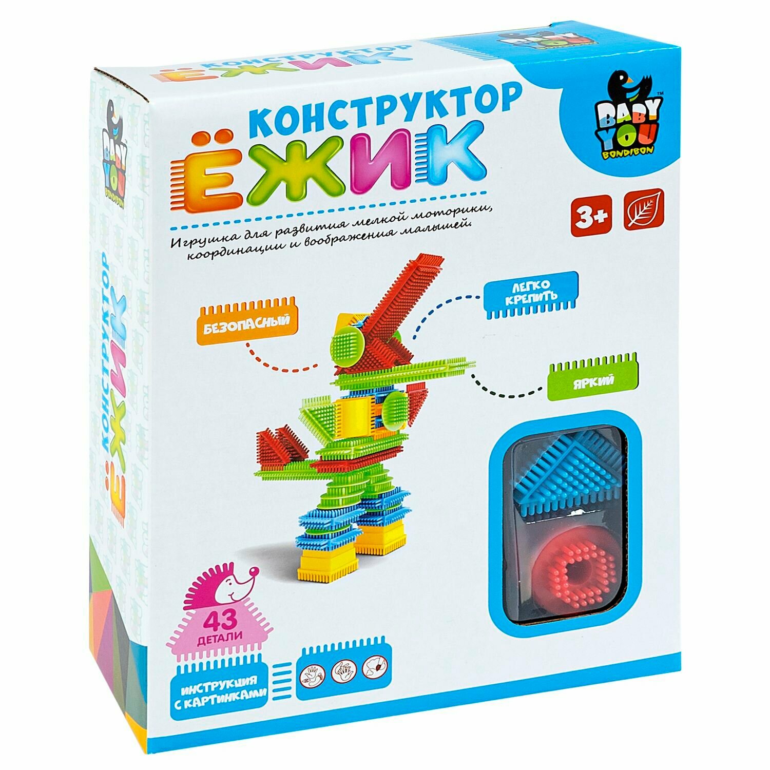 Благодаря специальной системе соединений, детали конструкторов-ёжиков от Bondibon Baby You очень удобны для детских пальчиков и легко соединяются между собой. Они изготовлены из высококачественного прочного, мягкого пластика и представлены в разнообразных цветах и геометрических формах. Элементы этого конструктора не ограничивают фантазию ребенка и дают возможность сконструировать любых героев, персонажей и предметы. Благодаря своей приятной ворсистой структуре игрушка стимулирует мелкую моторику и тактильное восприятие, оказывает массажный эффект на ладошки, а также развивает логическое и пространственное мышление.